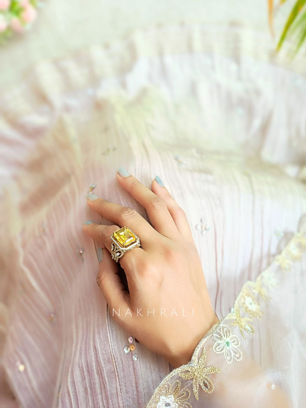 The Kanika Yellow Stone Statement Ring is a true showstopper, exuding luxury and sophistication. Featuring a striking yellow gemstone at its center, the ring is bordered with shimmering diamond accents, enhancing its brilliance and grandeur. Perfectly crafted for weddings, festive celebrations, and special evenings, this oversized design embodies bold elegance. Its vibrant hue adds a unique touch, making it the ultimate choice for women who love statement jewellery that turns heads.