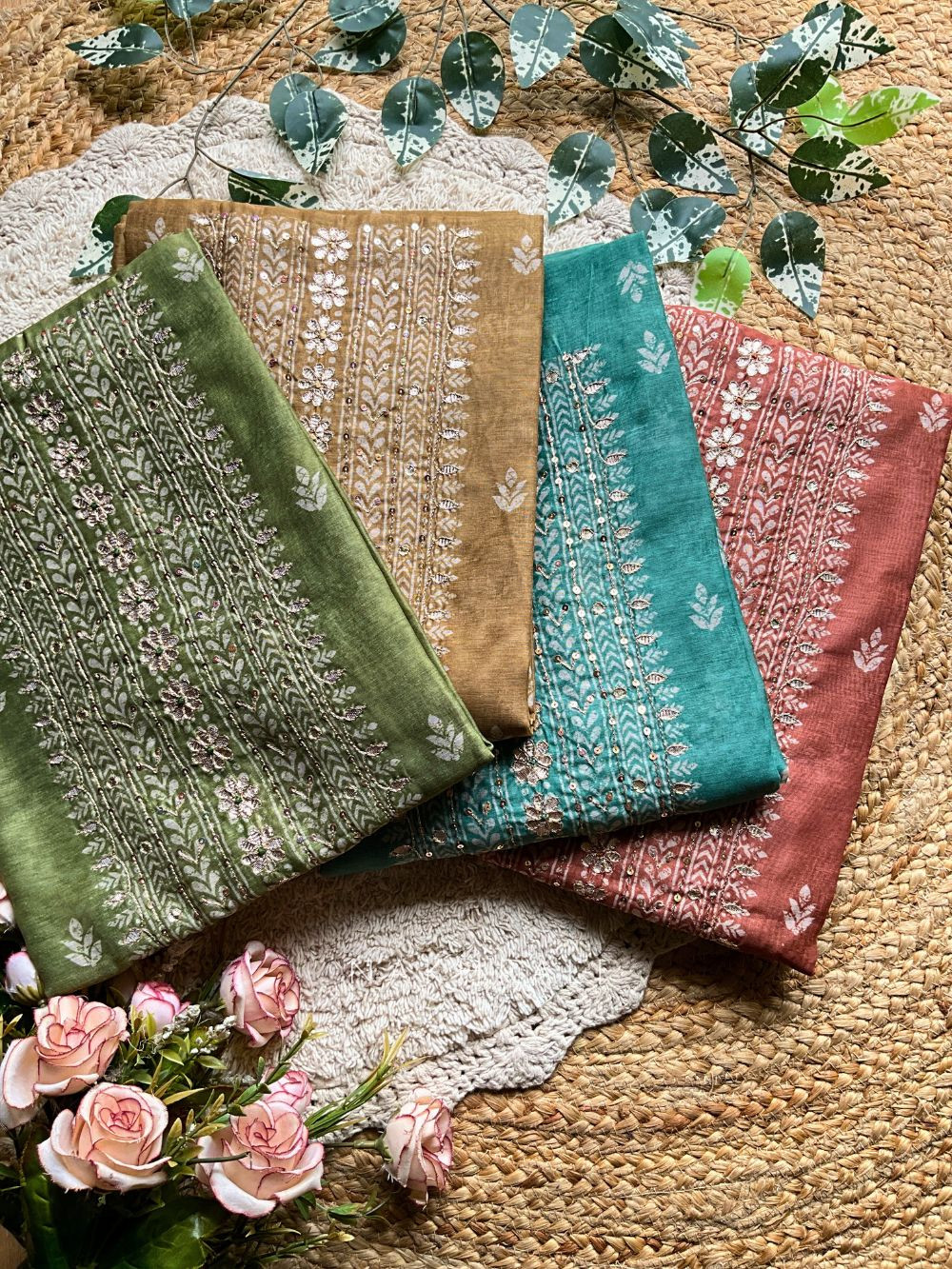 The Kanira Floral Embroidery Dress Material blends subtle hues with intricate detailing, making it perfect for both casual and festive wear. Available in sea green, mehendi green, pista green, and brown, each set features delicate floral embroidery on the kurta, complemented by a beautifully printed dupatta. Its timeless design makes it versatile for day events, festive gatherings, or semi-formal occasions. An elegant choice for women who love understated traditional charm with a modern touch.
