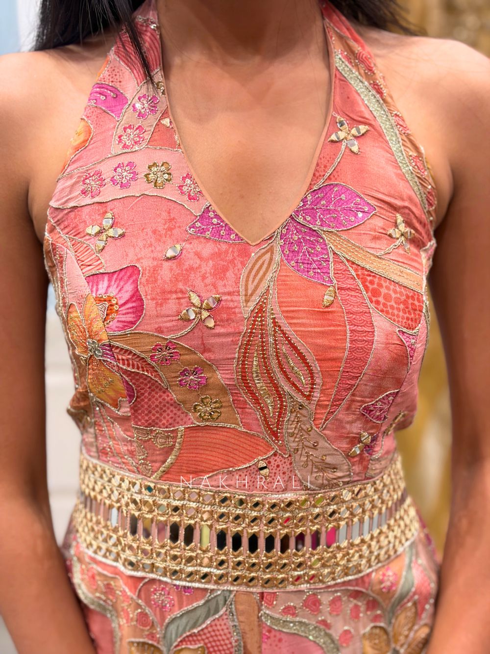 This jumpsuit showcases a detailed floral print enhanced with fine embroidery and subtle mirror work, adding depth and richness to the design. The halter neckline and fitted bodice create a structured look, while the flowy wide-leg pants bring effortless movement. Perfect for festive gatherings, cocktail events, and occasion wear where you want a modern yet ethnic-inspired outfit that stands out.