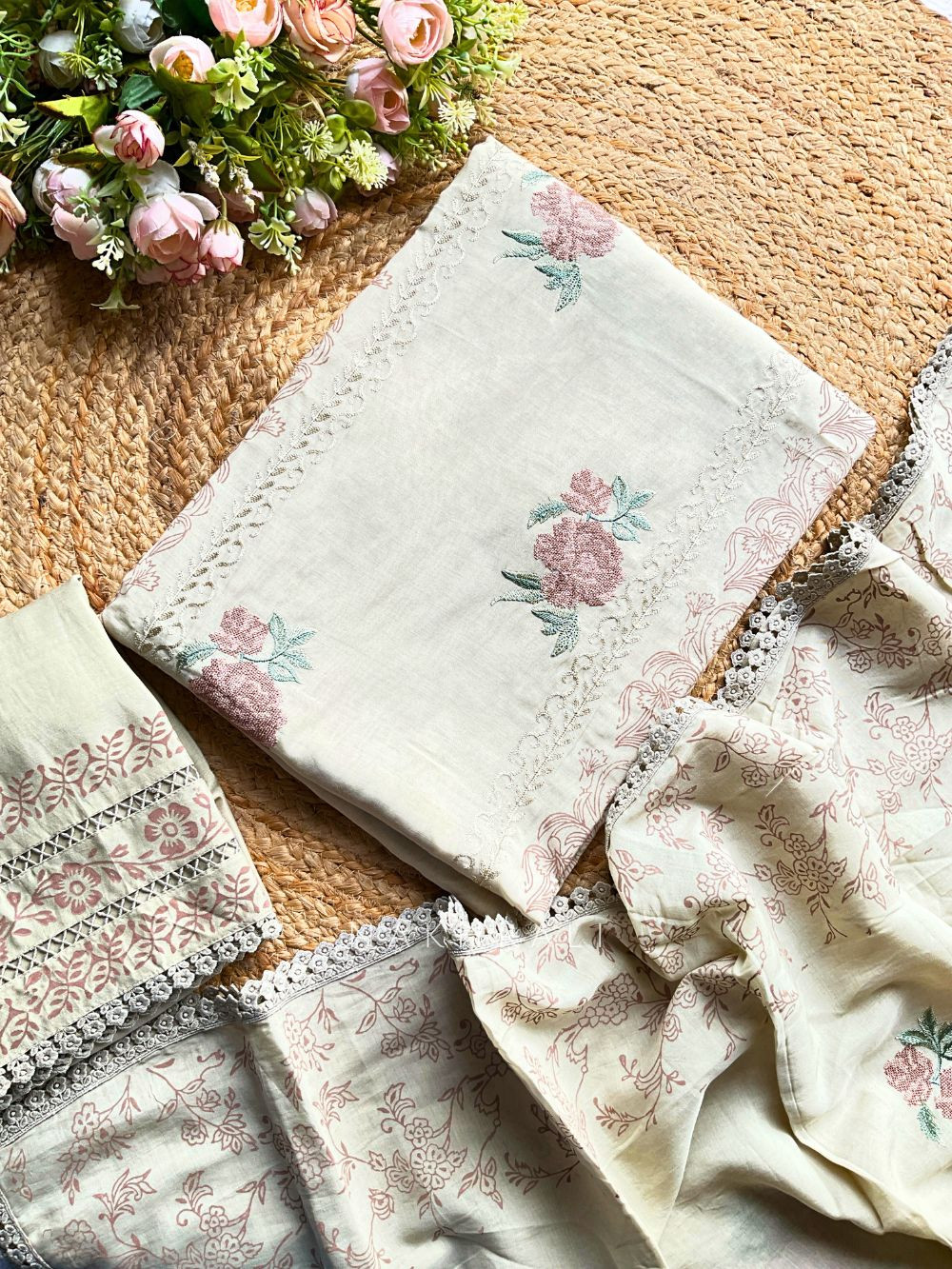 This elegant unstitched dress material set features subtle floral embroidery that adds a refined highlight, paired with soft all-over print detailing for a balanced look. The dupatta comes finished with lace edging for a neat, premium fall. Ideal for office wear, day events, casual outings, and small family gatherings. Stitch it your way: straight kurta, A-line, or short kurti with pants.