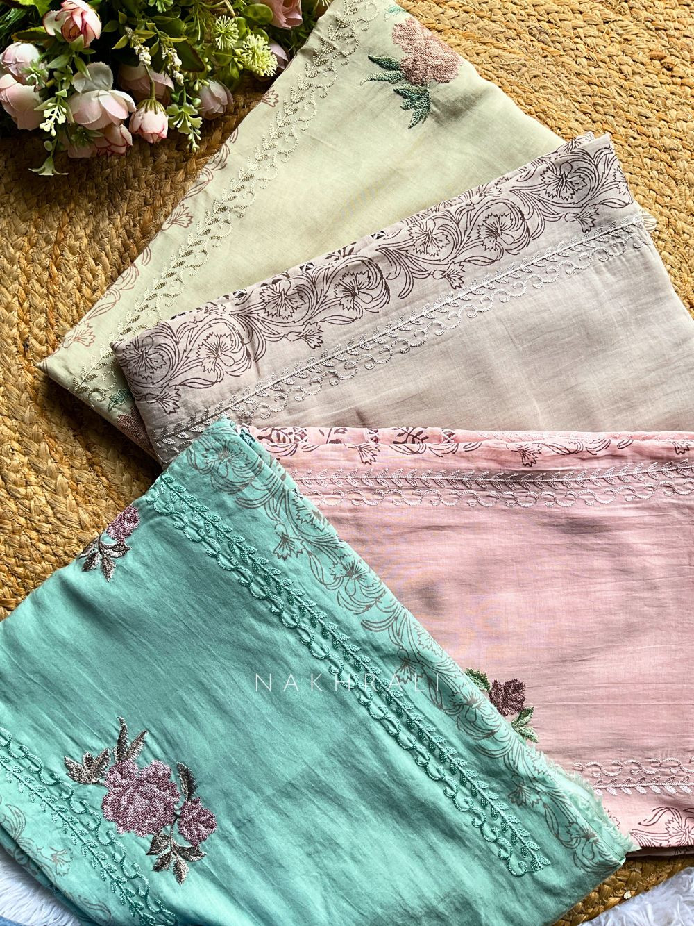 This elegant unstitched dress material set features subtle floral embroidery that adds a refined highlight, paired with soft all-over print detailing for a balanced look. The dupatta comes finished with lace edging for a neat, premium fall. Ideal for office wear, day events, casual outings, and small family gatherings. Stitch it your way: straight kurta, A-line, or short kurti with pants.
