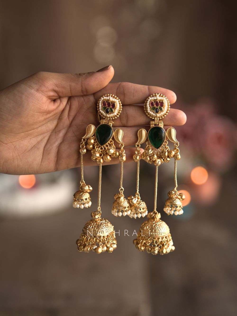 Keri Kashmiri Jhumka Earrings are inspired by traditional Kashmiri jewellery aesthetics, crafted with detailed kundan-style tops, textured gold-toned elements and cascading ghungroo chains that end in bold jhumkas. The layered structure adds depth, movement and a regal finish, making these earrings a standout choice for festive occasions and weddings. Designed to command attention, Keri blends heritage craftsmanship with a strong statement silhouette that elevates even the simplest outfit.