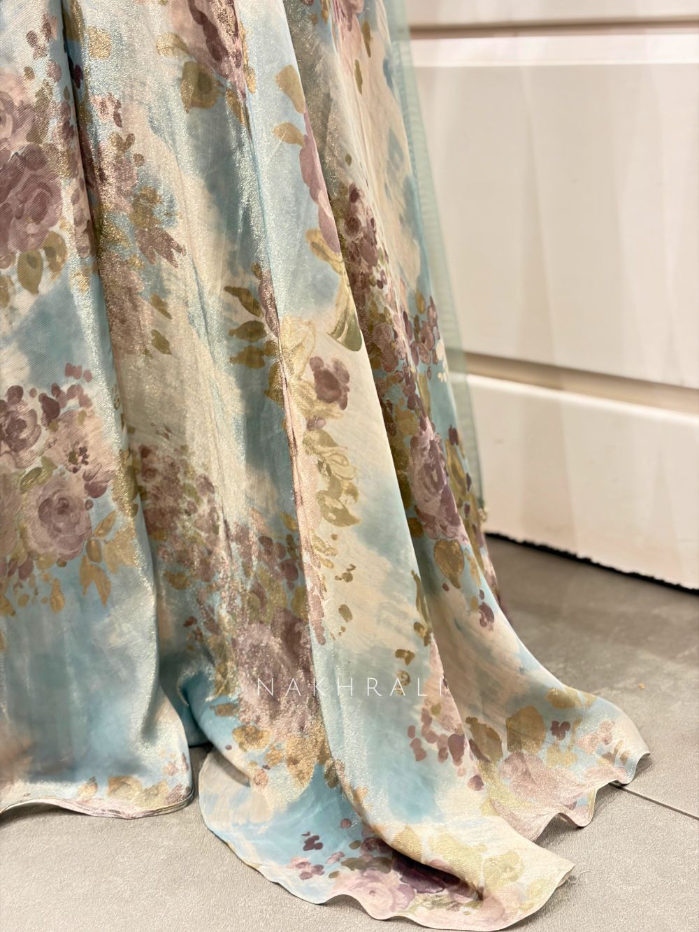 This indo western set features a sleeveless structured crop top adorned with dense stone embellishments and crystal detailing over a soft ombre floral printed base. The coordinated palazzo flows effortlessly with the same print, creating a balanced silhouette, while the dupatta adds graceful movement. Designed for modern festive dressing, this set blends subtle prints with statement sparkle, making it ideal for occasions where elegance meets contemporary styling.