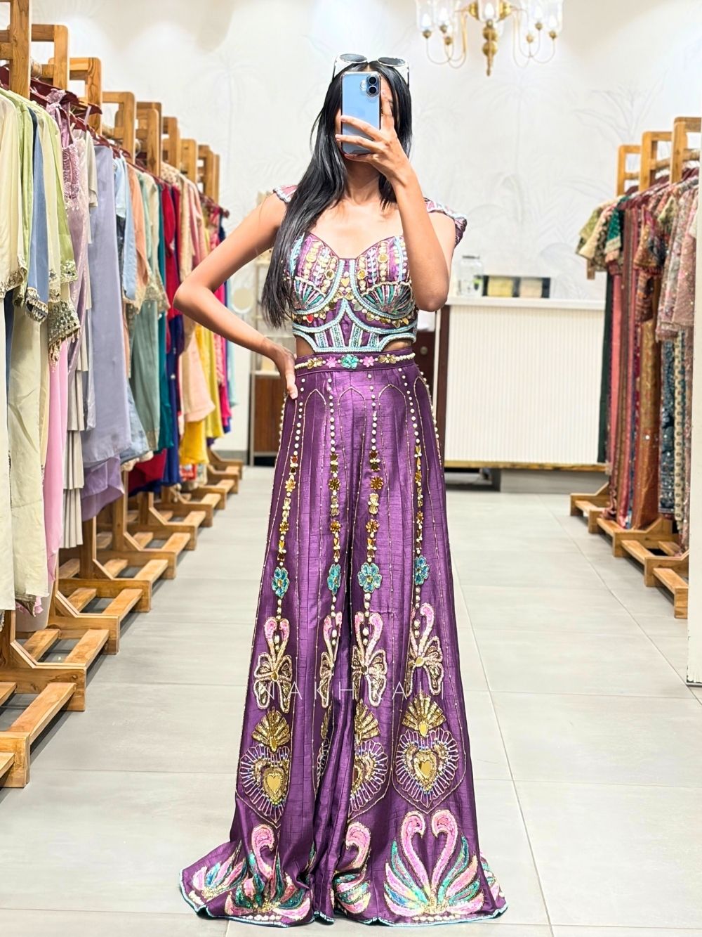 This jumpsuit showcases a rich purple base enhanced with detailed sequin and bead embellishments that create a striking visual appeal. The structured bodice with intricate pattern work adds definition, while the flared bottom ensures a balanced and flowy silhouette. Designed for cocktail events, festive gatherings, and evening occasions, this outfit blends contemporary styling with traditional embellishment for a standout look.