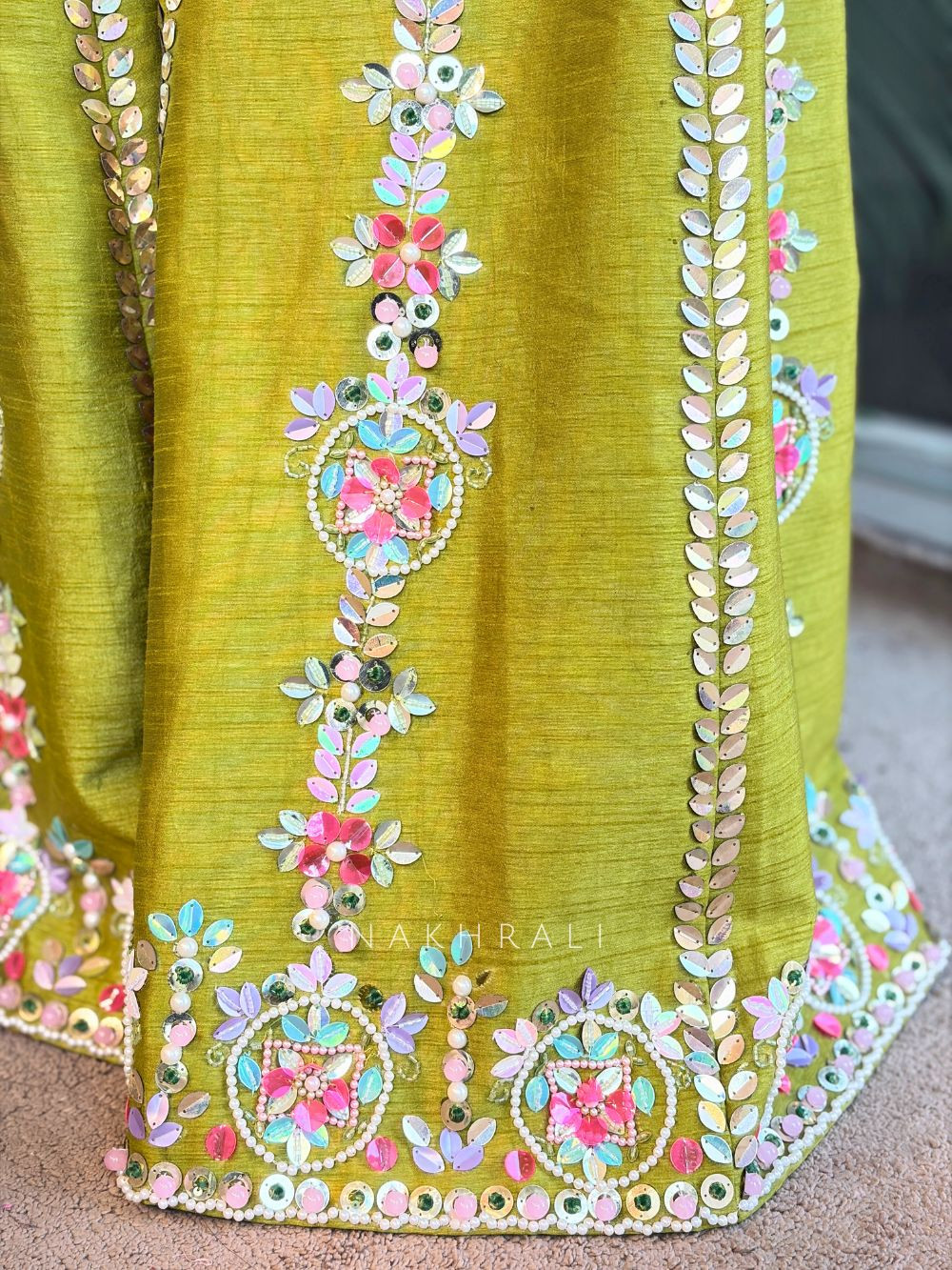 This green jumpsuit blends contemporary silhouette with traditional craftsmanship. The bodice is highlighted with delicate sequin and bead work arranged in floral and vine-inspired patterns, creating refined shimmer without heaviness. The structured neckline and cut-out detail add definition, while the flowing lower half ensures ease and grace. Designed as a complete statement outfit, this jumpsuit is perfect for festive gatherings, pre-wedding functions, and stylish celebrations where you want elegance without layering.