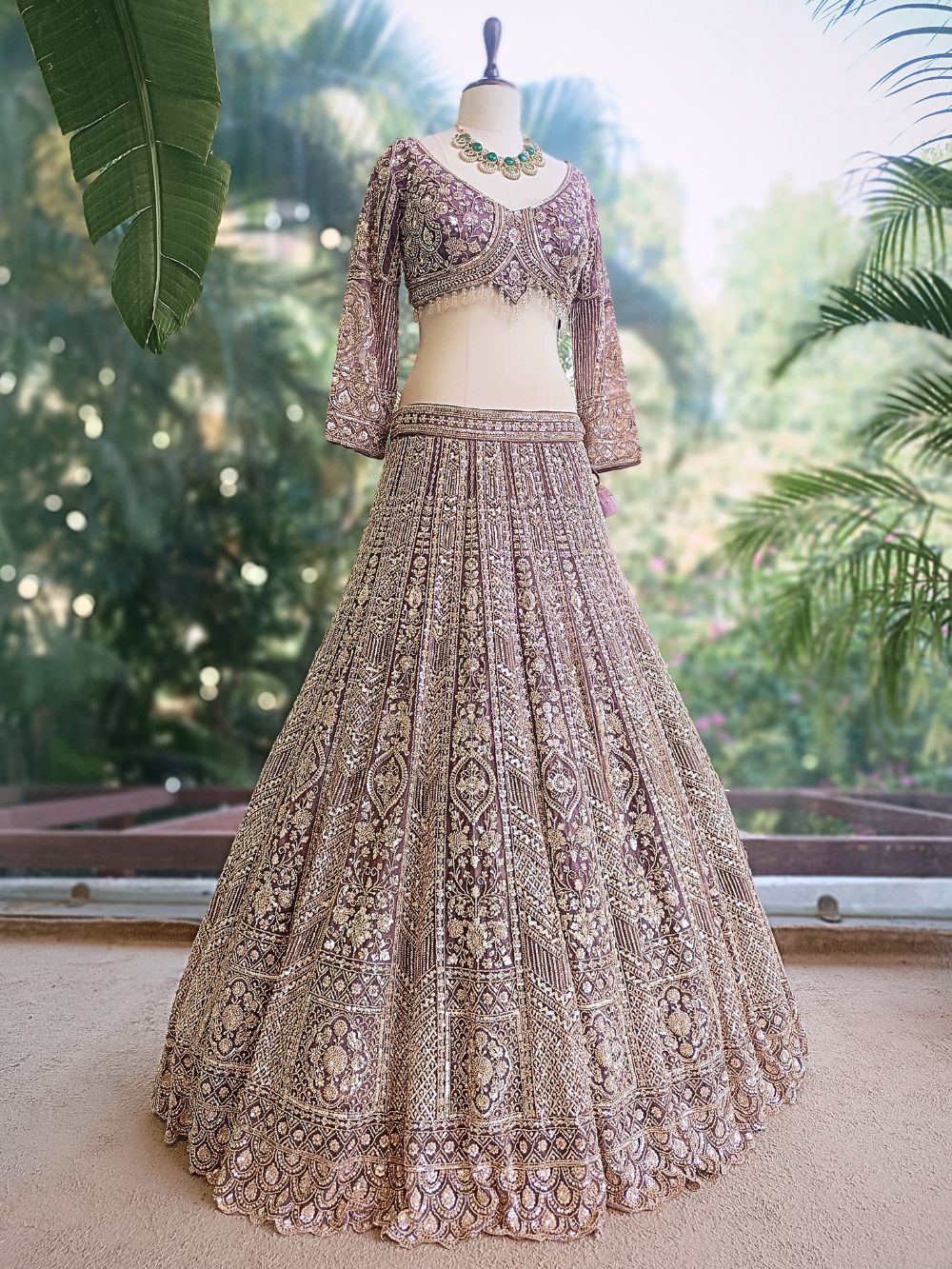 This lehenga set showcases detailed craftsmanship with cut dana and sequin embellishments intricately spread across the flared silhouette, creating a rich and luminous effect. The blouse features a flattering neckline with coordinated heavy detailing, while the dupatta adds softness with delicate embroidery and a finished border. Designed for weddings, receptions and sangeet nights, it offers a perfect balance of traditional elegance and modern sophistication.