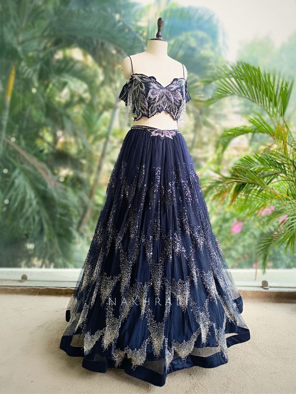 Dry clean only. Keep away from direct sunlight. Store in a muslin cloth to maintain shine. Avoid contact with perfumes or sprays. Handle with care to preserve delicate embroidery.