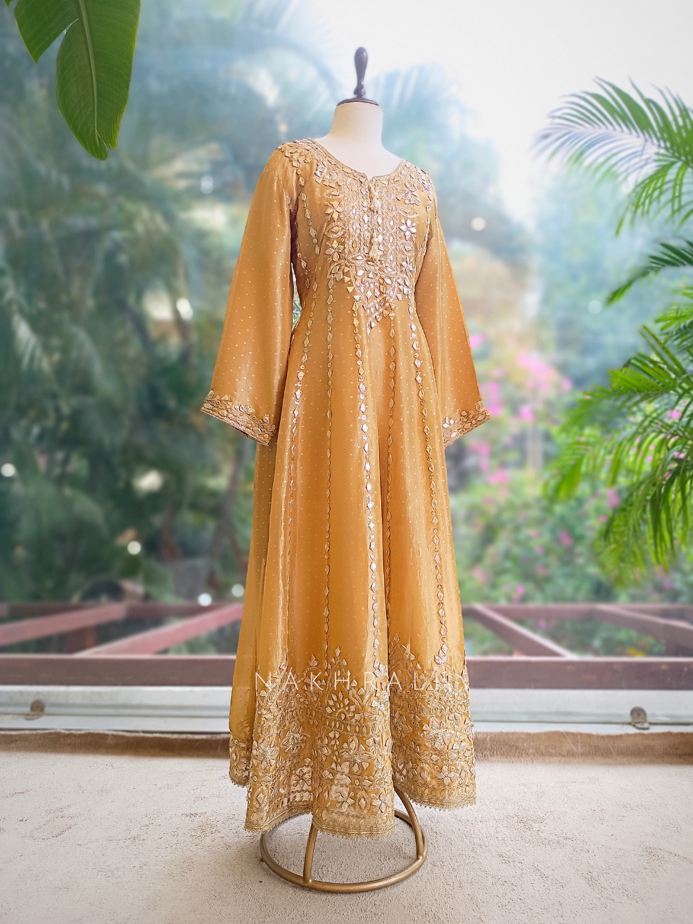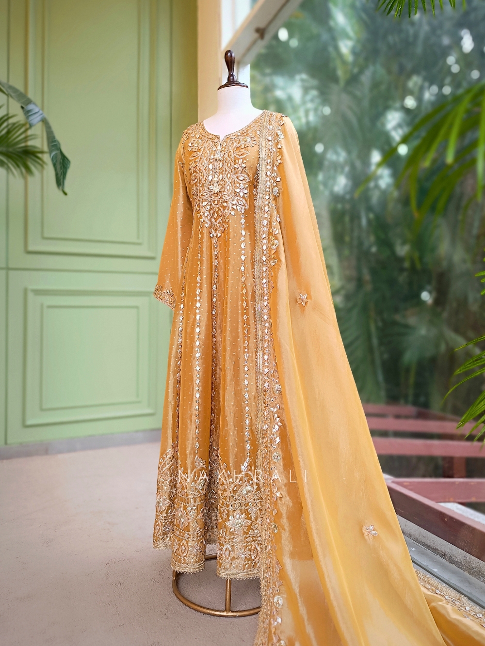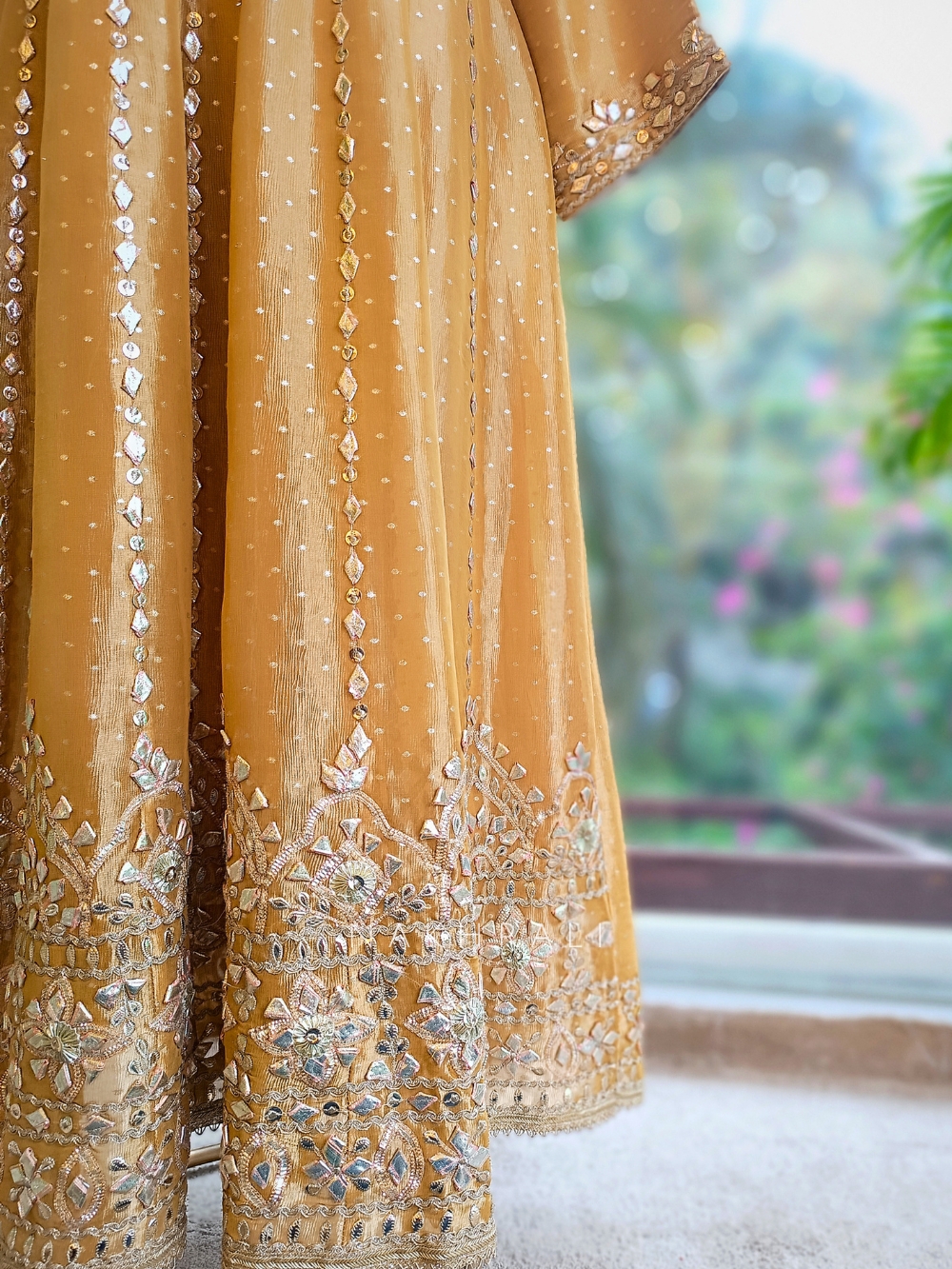 Bridal Trousseau: Pair with statement chandbali earrings, soft curls, and embellished heels for a graceful bridal celebration look.