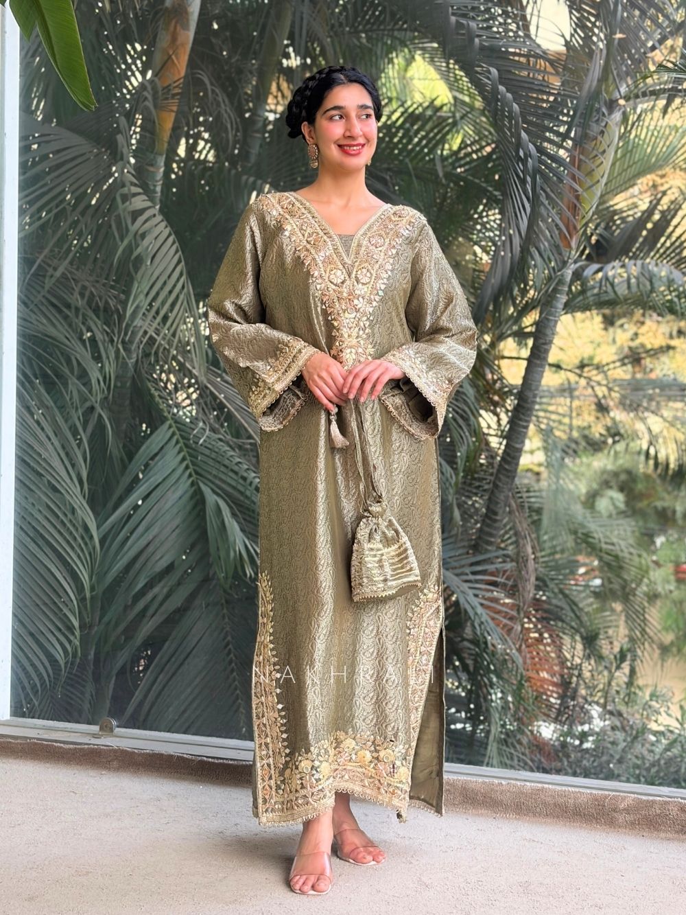 This straight dress is crafted for women who appreciate understated luxury with detailed craftsmanship. The highlight lies in its beautifully structured neckline and sleeves, adorned with intricate zari gota work enhanced with delicate mirror embellishments. The silhouette remains clean and graceful, allowing the embellishment to stand out without overpowering the look. Designed to fall fluidly, this dress offers comfort while maintaining a festive presence. Ideal for celebrations, family gatherings, festive dinners, and elegant occasions where subtle glamour makes the strongest statement.