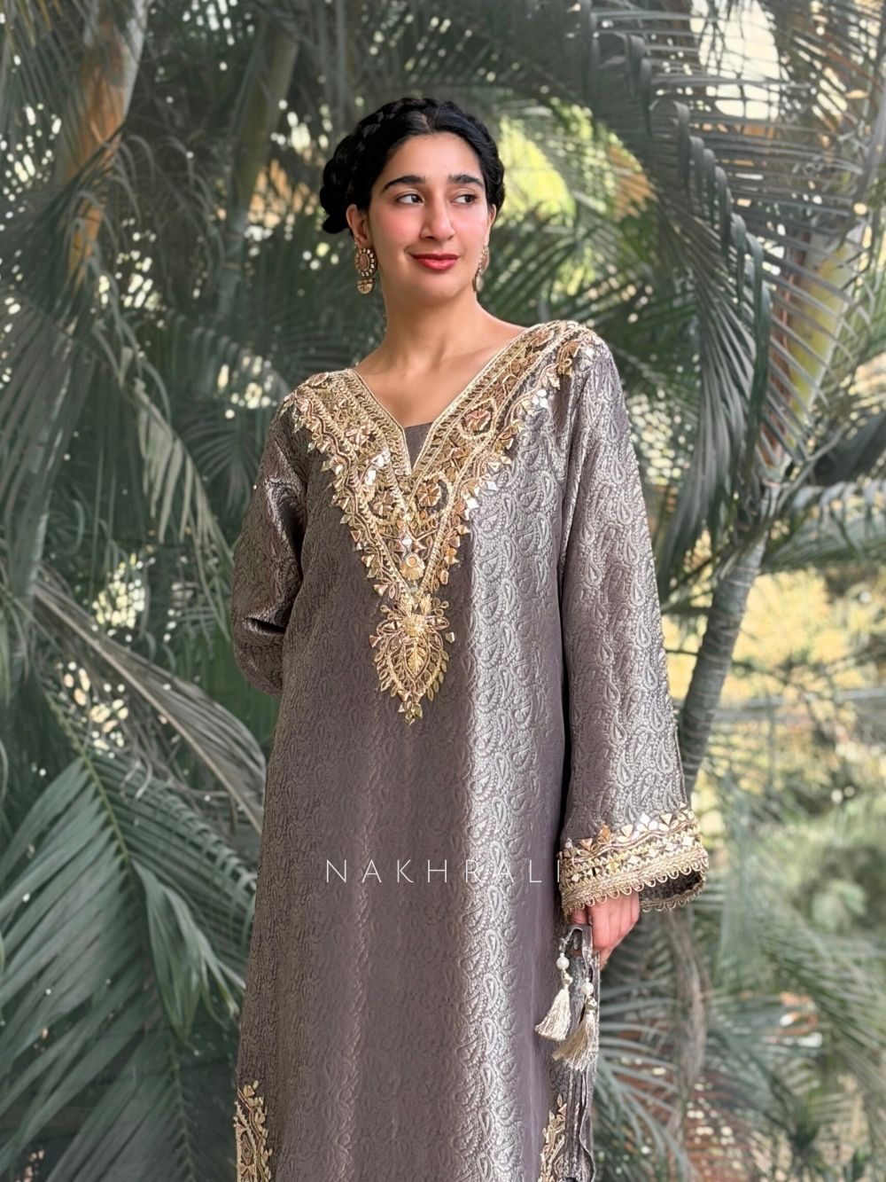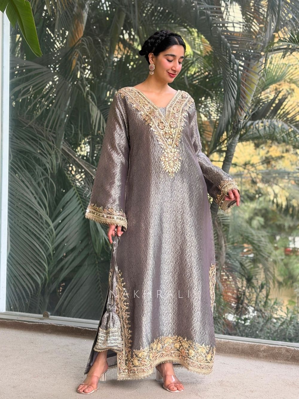 Kyra Grey Straight Dress with Mirror Zari Work