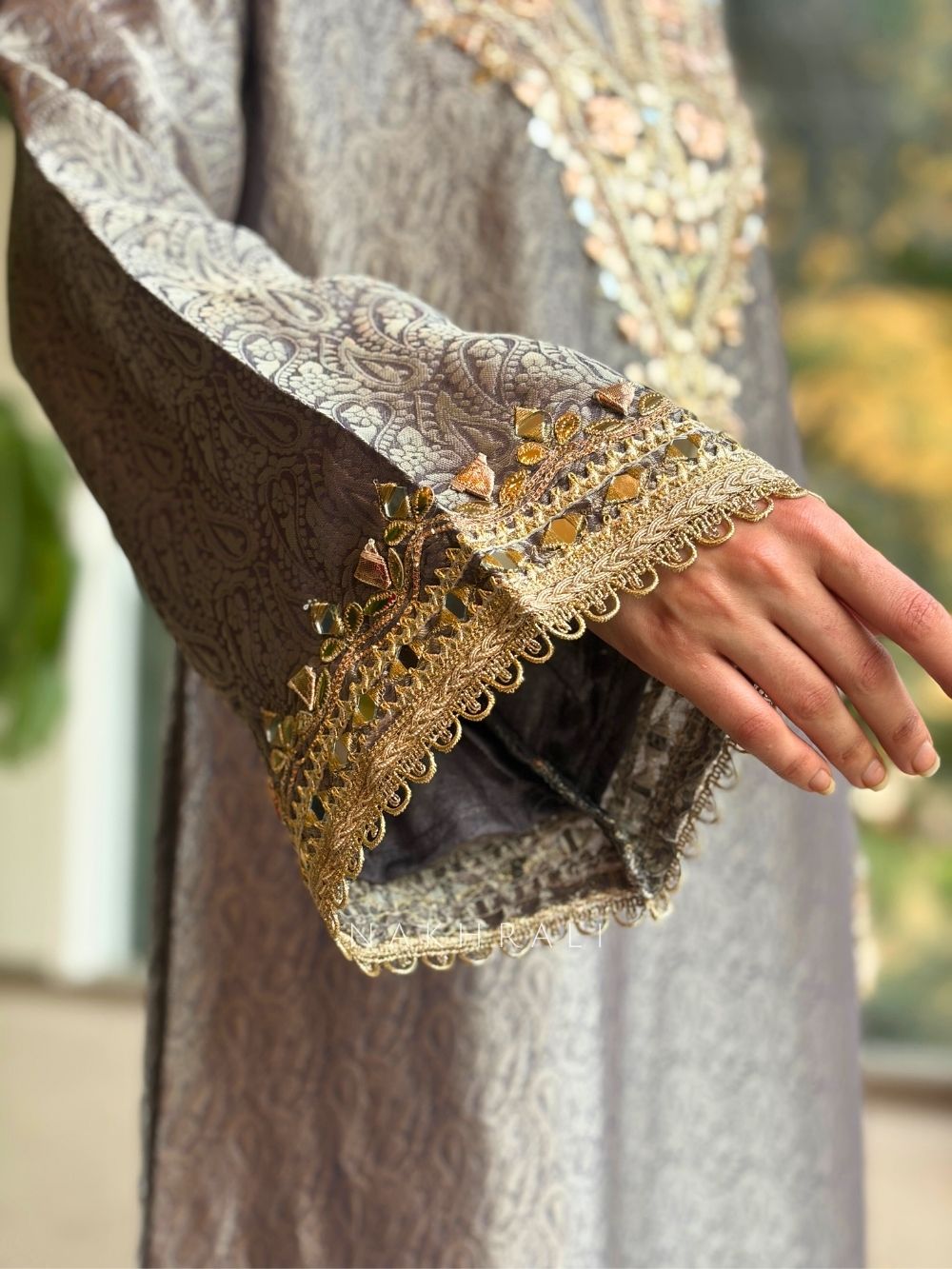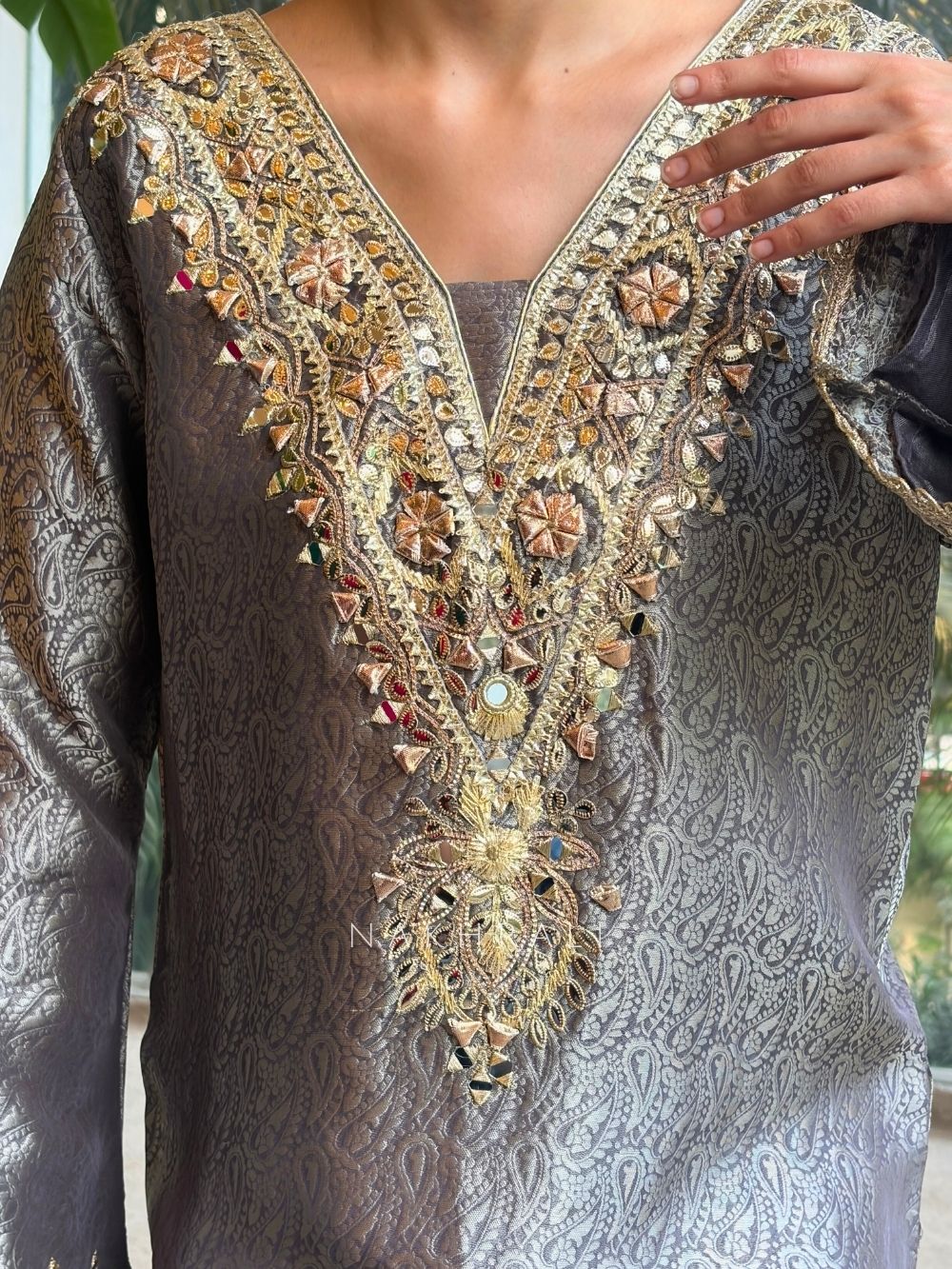 This straight dress is crafted for women who appreciate understated luxury with detailed craftsmanship. The highlight lies in its beautifully structured neckline and sleeves, adorned with intricate zari gota work enhanced with delicate mirror embellishments. The silhouette remains clean and graceful, allowing the embellishment to stand out without overpowering the look. Designed to fall fluidly, this dress offers comfort while maintaining a festive presence. Ideal for celebrations, family gatherings, festive dinners, and elegant occasions where subtle glamour makes the strongest statement.