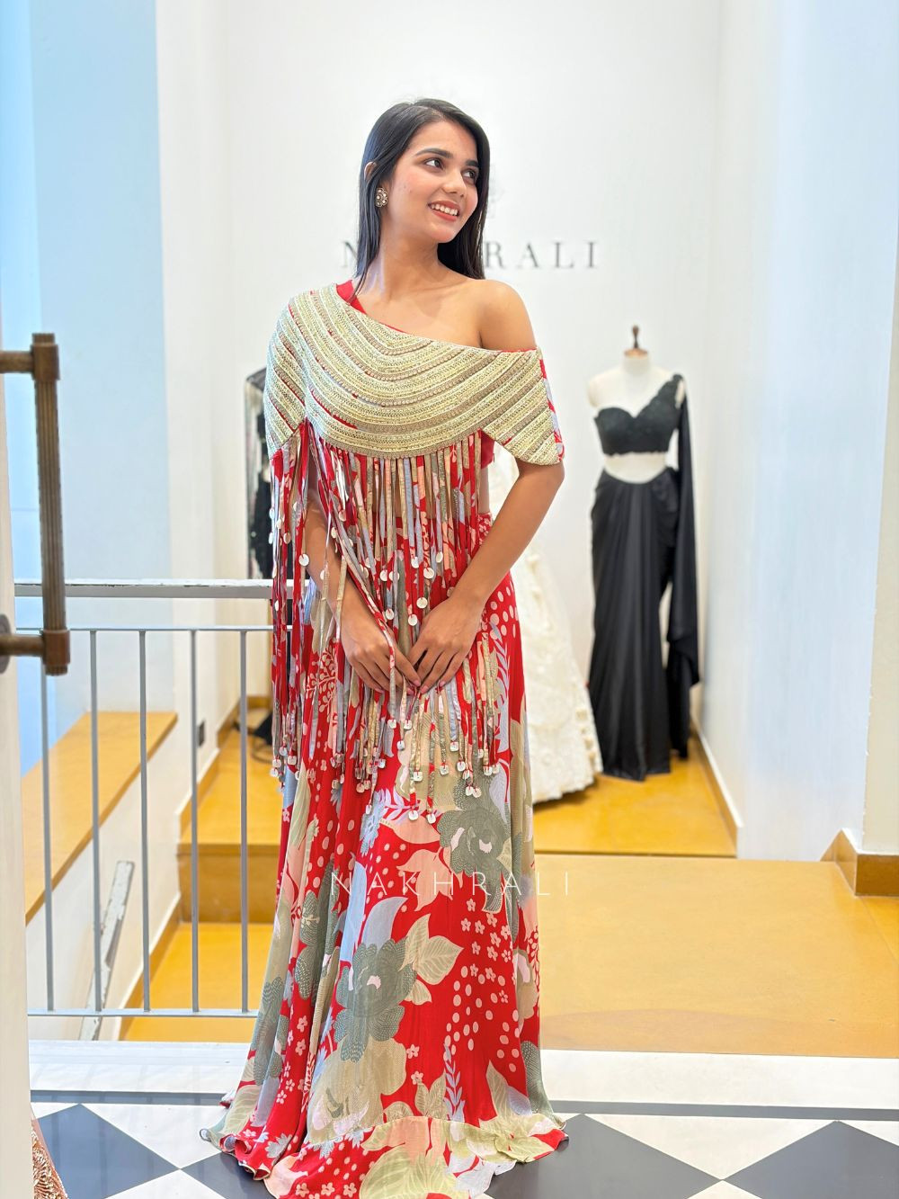 This crop top and skirt set is designed for effortless elegance, highlighted by a beautifully crafted cape with layered embroidery and delicate hanging details. The printed skirt flows fluidly, creating movement with every step, while the structured crop top balances the silhouette. The cape adds a festive statement without overpowering the look, making this set ideal for celebrations, festive evenings, and modern wedding functions. Available in red and green, each shade carries its own charm while keeping the design timeless.