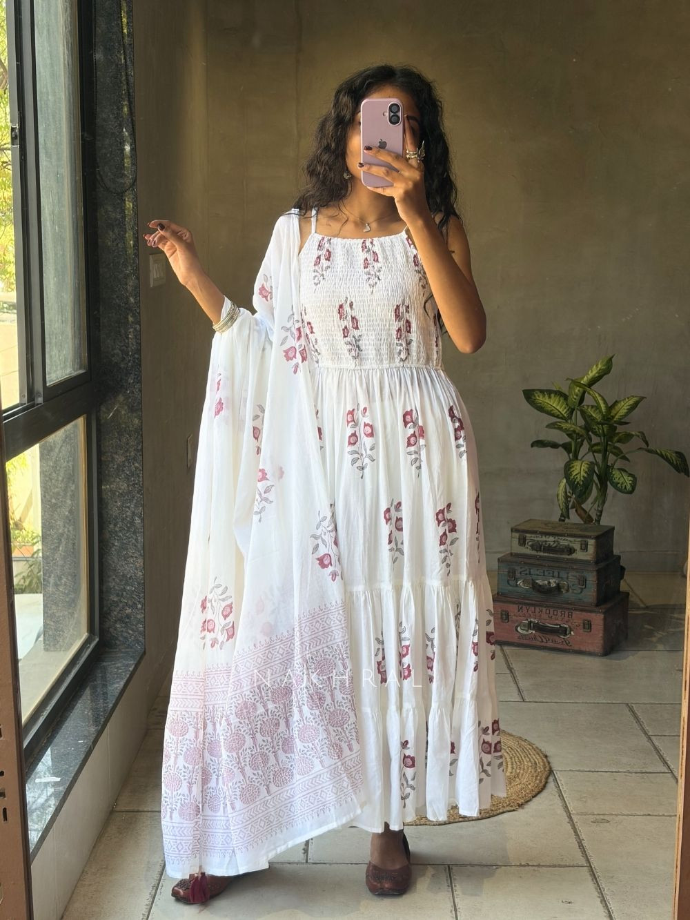 This cotton suit set is designed with a breezy flared silhouette that creates beautiful movement and effortless comfort. The kurta features delicate floral prints that add a subtle feminine charm while the smocked bodice and thin shoulder straps bring a modern touch to the traditional style. The coordinated dupatta is finished with soft printed borders that complement the outfit beautifully. Crafted in breathable cotton, this ensemble feels light and comfortable, making it ideal for warm days, casual outings, relaxed gatherings and easy daytime styling.