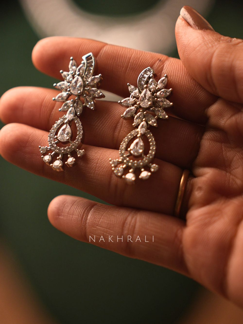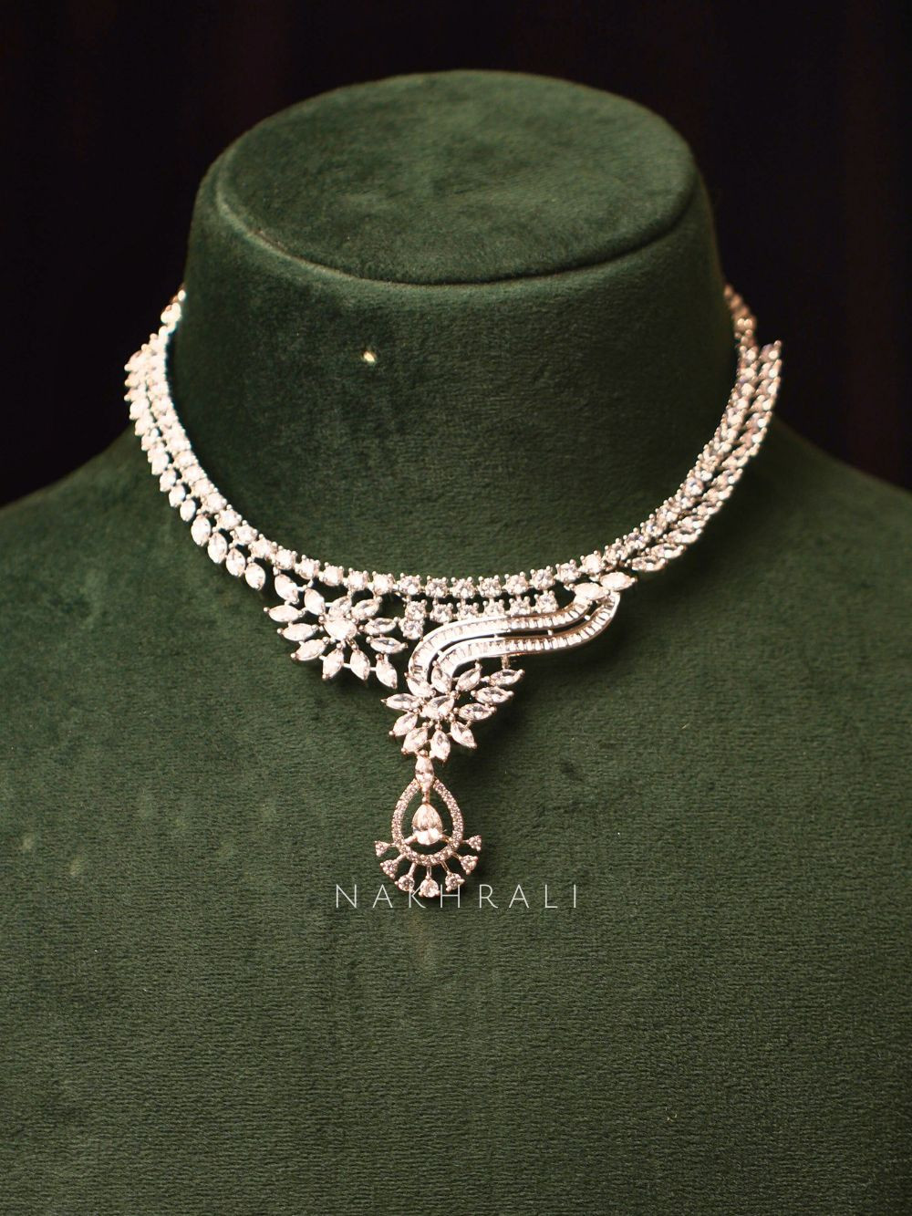 This silver-finish necklace set showcases a graceful layered design highlighted with precision-cut cubic zirconia stones that reflect light beautifully. The central motif flows into a delicate drop detail adding movement and finesse, while the matching earrings mirror the same refined craftsmanship. Balanced in shine and structure, this set elevates traditional and contemporary outfits alike, making it ideal for weddings festive celebrations receptions and special evenings where understated luxury is key.