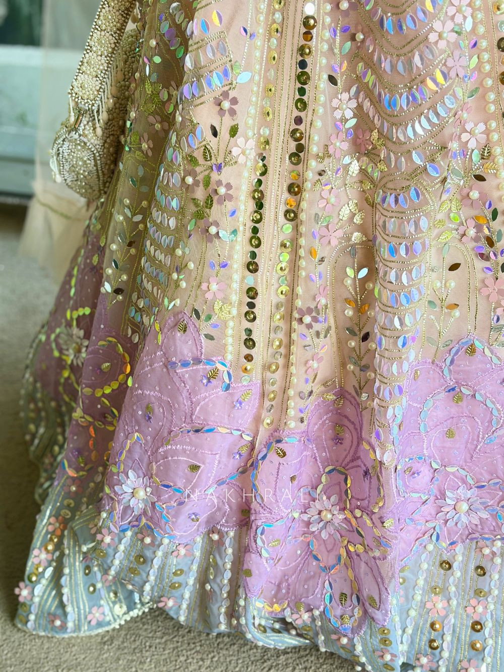 This pink lehenga stands out with its all-over sequin detailing, reflective beadwork and delicate 3D floral motifs. The modern cut-work blouse features intricate hand embellishment and pearl edging, giving the piece a glamorous yet soft look. The sheer cape-style dupatta adds an effortless contemporary touch. Ideal for sangeet, cocktail nights and lavish celebrations, this set blends shimmer, pastel beauty and a statement silhouette with ease.