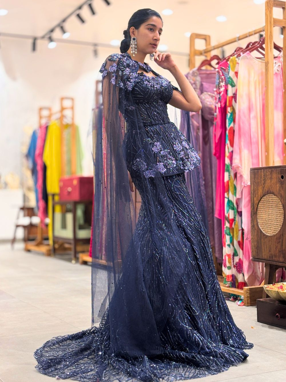 The Luna Dark Blue Peplum Indo-Western Lehenga is a show-stopper crafted for modern celebrations. Featuring a structured peplum blouse richly adorned with cut dana and bead detailing, it flows into a sleek mermaid skirt that accentuates your silhouette. A dramatic sheer cape drapes elegantly over the shoulders, giving the outfit a regal and contemporary touch. Perfect for cocktail nights, receptions, or grand soirées, this lehenga blends tradition with modern glamour effortlessly.