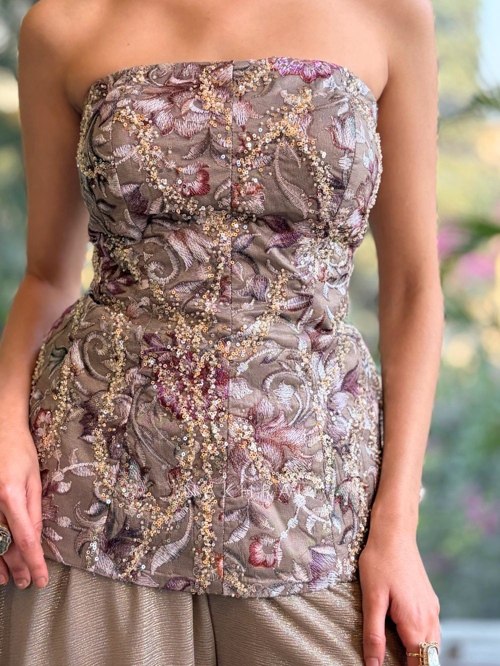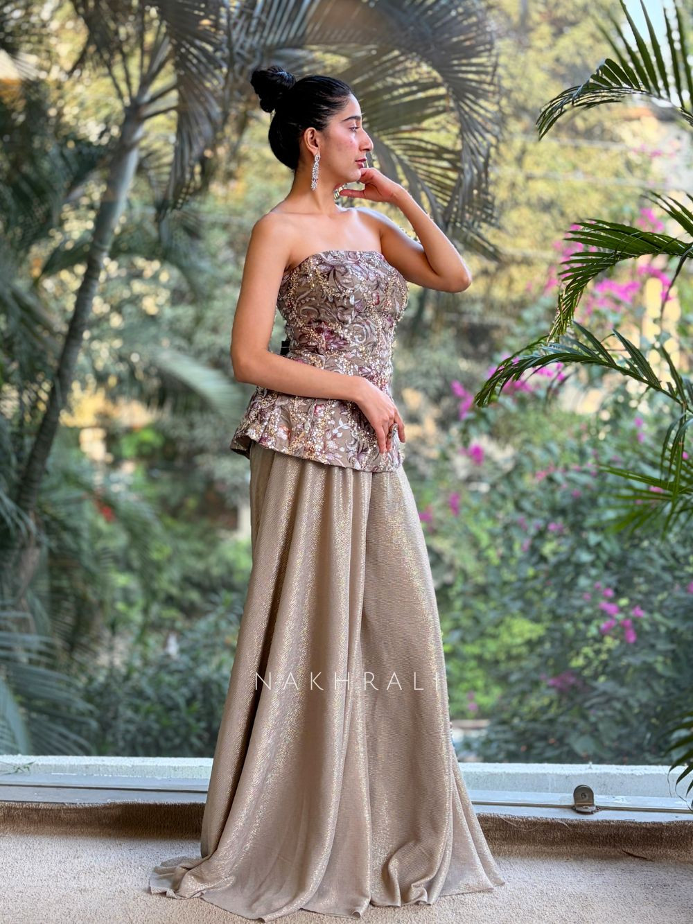 This brown top palazzo set blends elegance with modern glamour through its beautifully embroidered and sequin-detailed strapless top. The structured silhouette enhances the waist while the soft peplum fall adds a feminine finish. Paired with a shimmery palazzo that flows effortlessly, the set creates a balanced and luxurious look perfect for evening functions, cocktails and intimate festive gatherings. The subtle shine and intricate detailing make it a standout yet graceful ensemble.