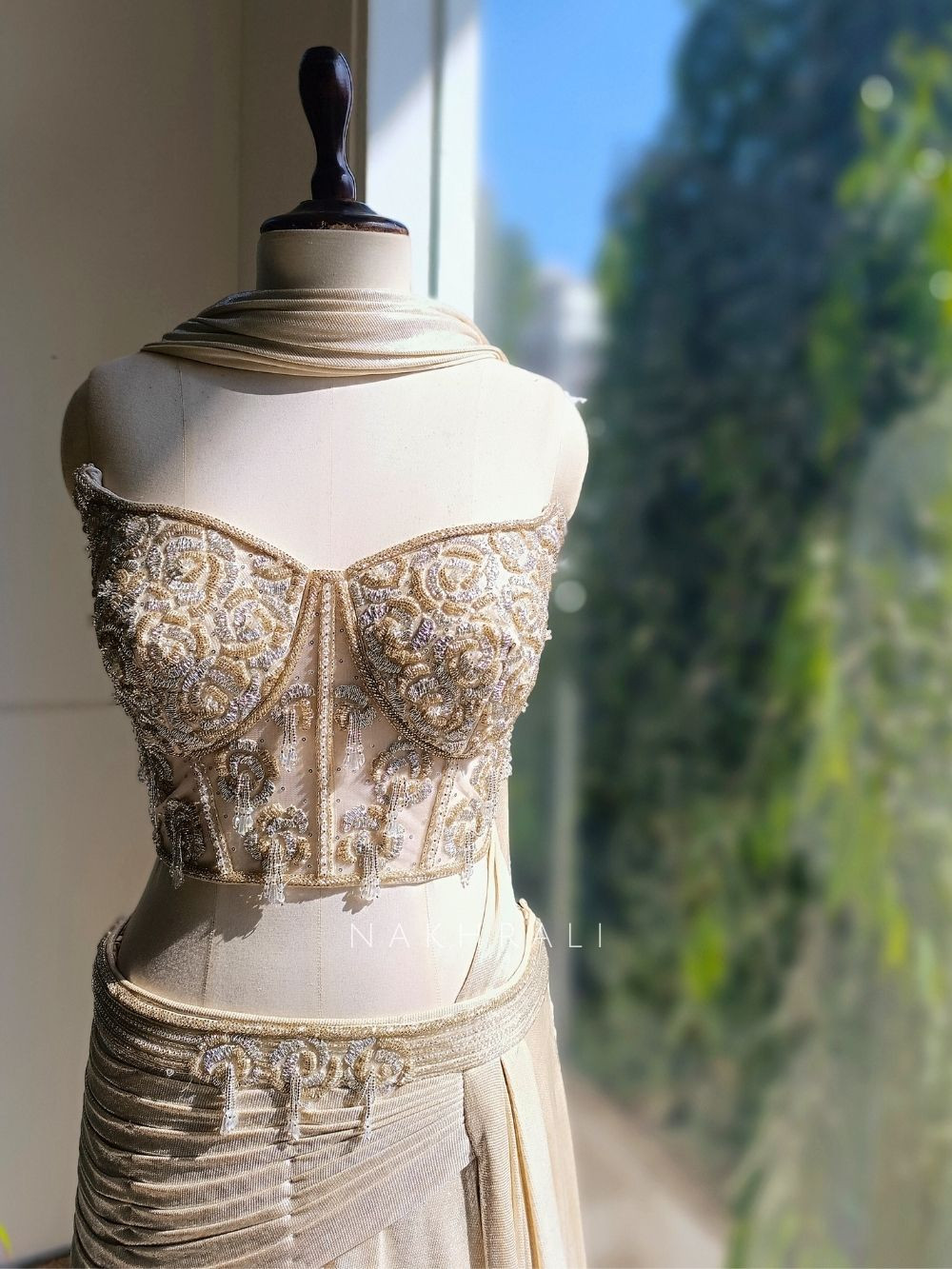 Ivory Crest is a modern indo-western lehenga set crafted for women who prefer elegance with restraint. The set features a structured bustier-style blouse adorned with intricate tonal embroidery and delicate bead accents, paired with a soft, flowy lehenga skirt that drapes effortlessly with subtle sheen. The minimalist silhouette balances glamour and comfort, making it ideal for cocktail functions, receptions, engagement parties, and intimate celebrations. Designed to stand out without overpowering, this ensemble delivers a polished, contemporary look with timeless appeal.