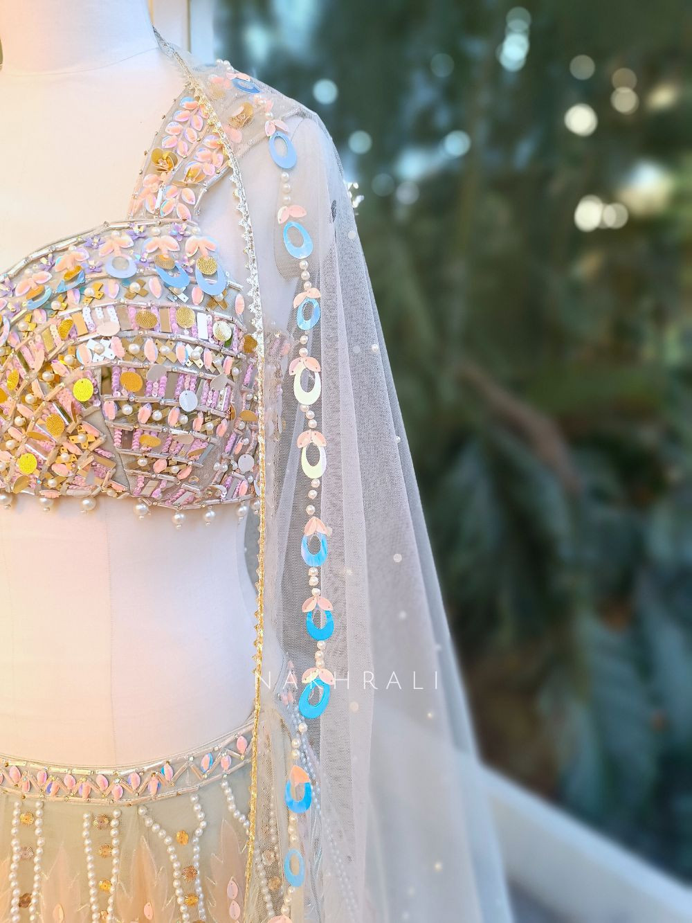 This pink lehenga set brings a celestial charm with its shimmering sequins and hand-placed bead detailing all over the net surface. The voluminous flare features intricate patterns that reflect light beautifully, creating a soft iridescent glow with every movement. The embellished blouse adds structure and luxury, completing the look with modern elegance. Ideal for sangeet, reception, and high-glam wedding events, this ensemble is designed to make a striking statement while keeping the overall vibe romantic and ethereal.