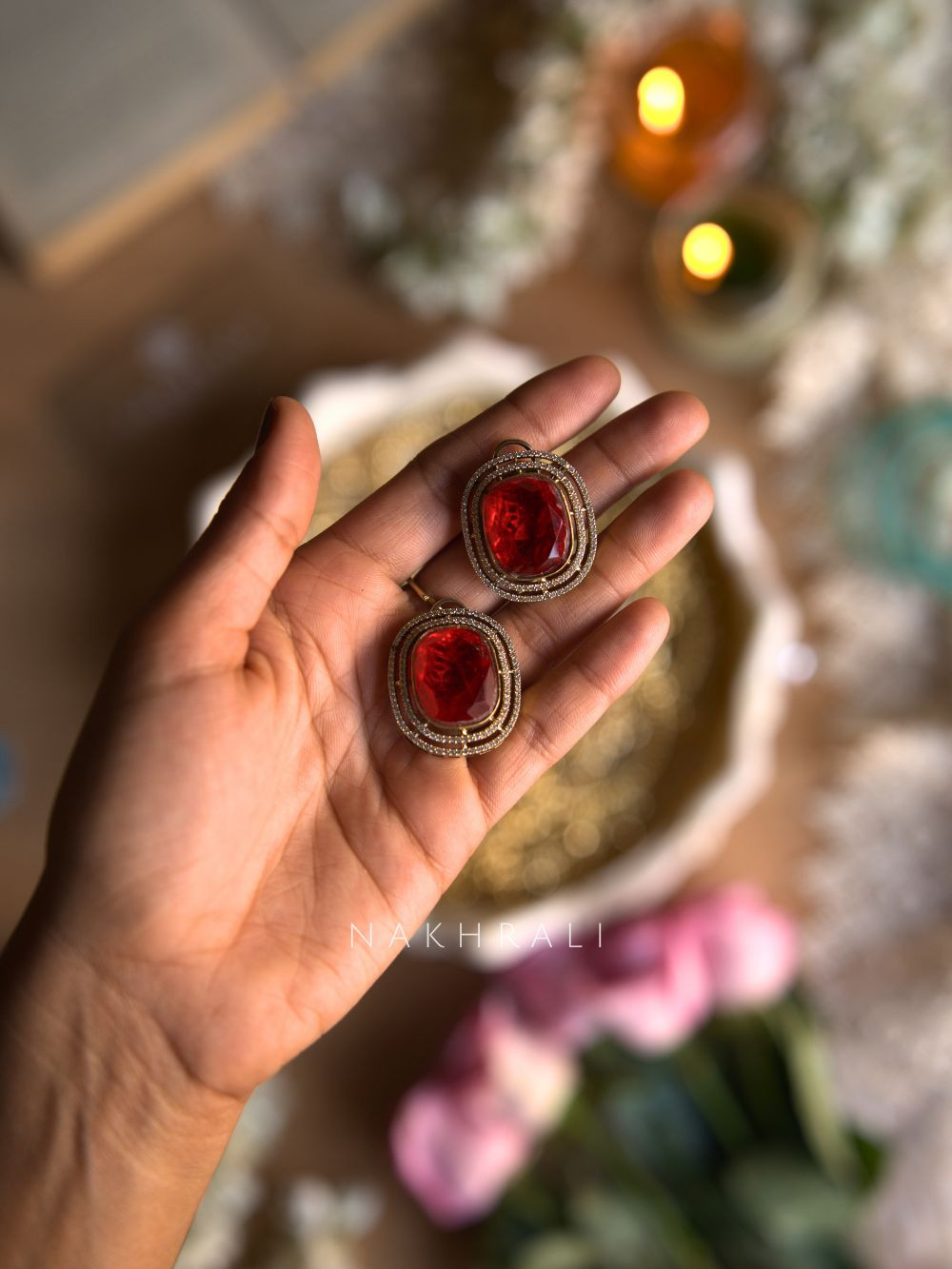 These statement earrings feature a striking oval-cut stone set at the center, surrounded by delicate crystal embellishments that enhance its depth and brilliance. The structured silhouette gives the earrings a luxurious, polished appearance while maintaining a balanced and wearable size. Designed to complement both traditional and contemporary outfits, they pair effortlessly with sarees, suits, draped ensembles, and evening wear. The refined craftsmanship and rich color tones make them a versatile choice for festive occasions, celebrations, and special events.