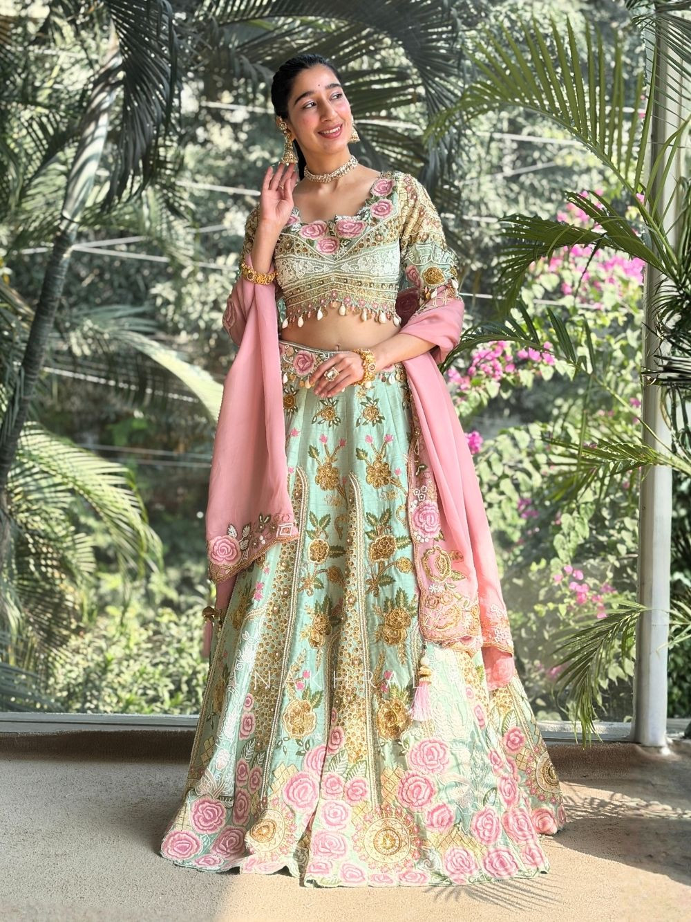 This sea green bridal lehenga features elaborate floral embroidery across every panel, giving it a luxurious yet soft bridal appeal. The blouse is richly hand-worked with pearls, sequins and textured detailing, while the lehenga showcases blooming motifs and ornate patterns that add depth and dimension. Paired with an embroidered dupatta edged with floral borders and tassels, the ensemble blends elegance, colour and craftsmanship—perfect for daylight pheras, pastel-themed weddings and modern bridal portraits.