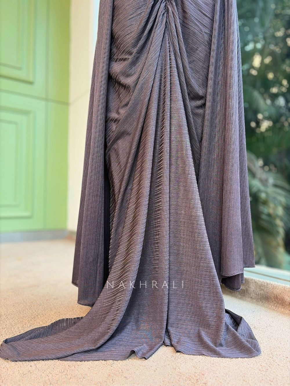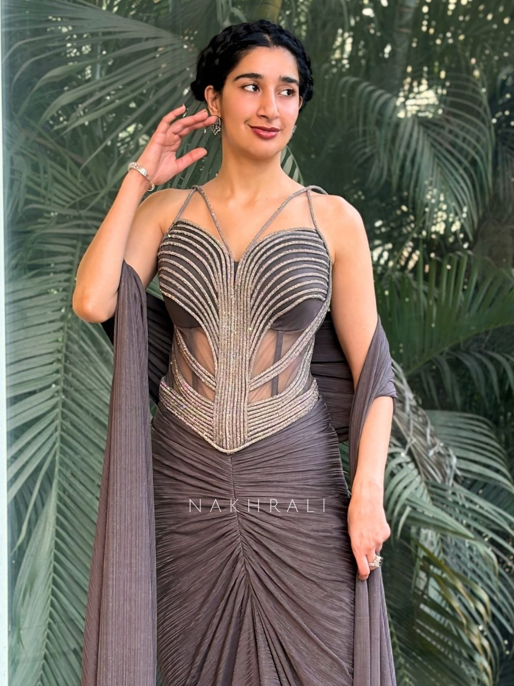 This grey indo-western set is designed with a sculpted corset blouse detailed with linear metallic embellishments and sheer panel accents that create a defined silhouette. It is paired with a softly ruched drape skirt that falls fluidly, adding movement and elegance to the look. The set is completed with a matching lightweight scarf that enhances styling versatility. Ideal for cocktail nights, festive gatherings, and modern wedding events where contemporary Indian dressing is preferred.