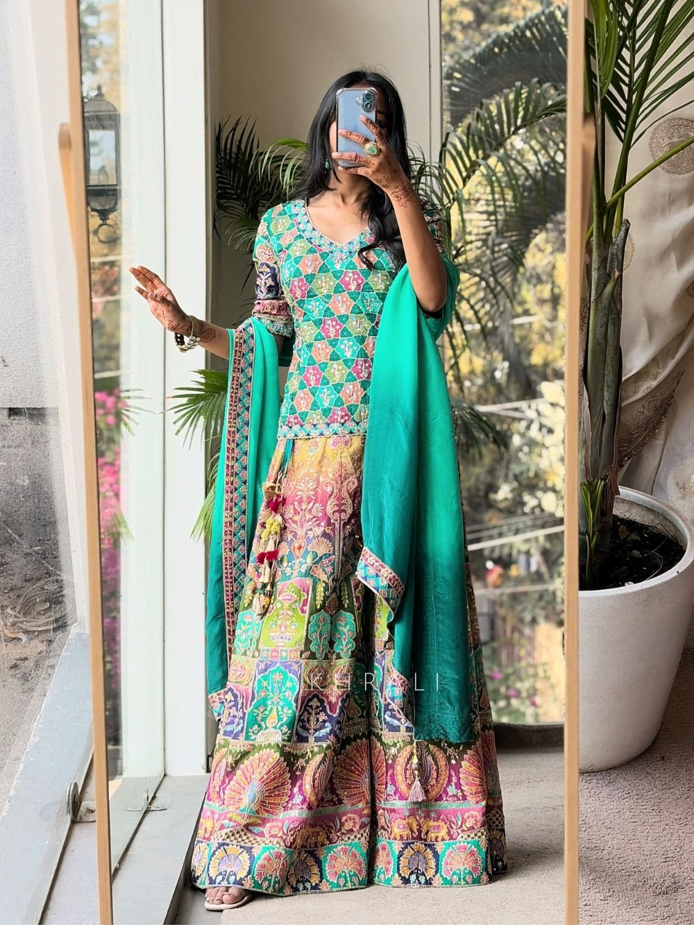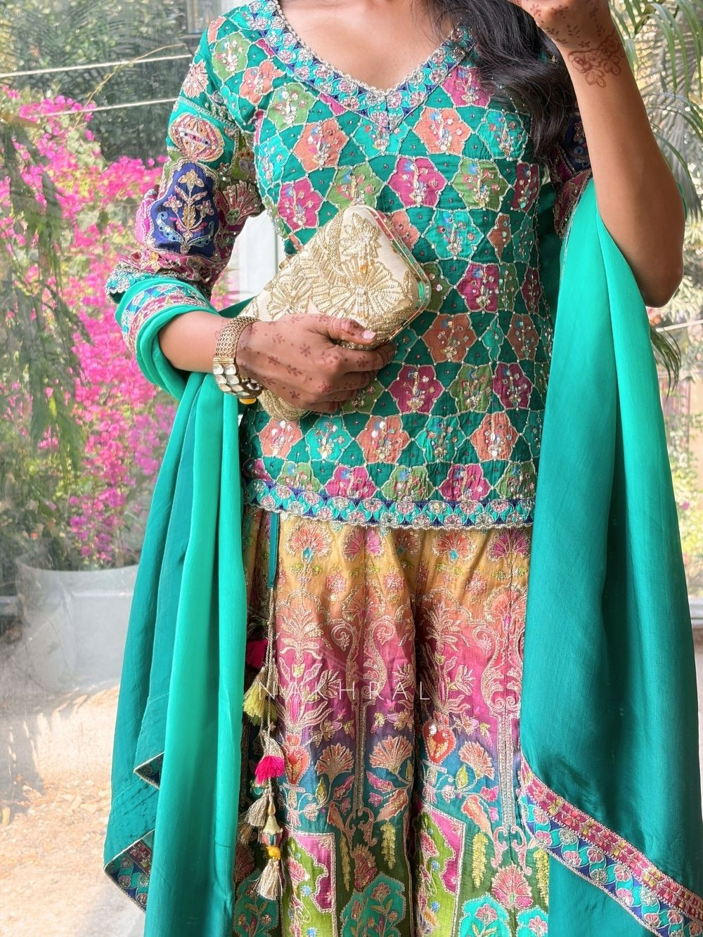 This multicolor suit set stands out with its rich, detailed patterns and elaborate surface work that create depth and visual interest from every angle. The kurta showcases a beautifully structured silhouette enhanced with intricate handcrafted motifs, while the flared bottom adds graceful movement. The coordinated dupatta completes the ensemble with matching borders and detailing, making the set ideal for festive gatherings, wedding functions, and celebratory occasions where you want to make a bold yet elegant impression.
