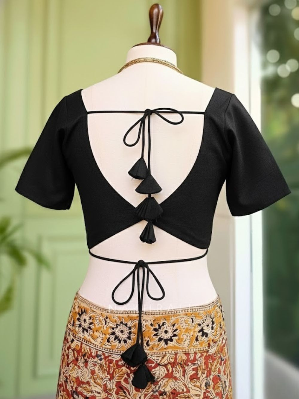 The Malika Cotton Silk Blouse features a deep V-neckline, structured cups, and wide shoulder coverage for a sculpted silhouette. The back is finished with graceful dori ties and leaf-shaped tassels, adding an elegant charm. Crafted for comfort and style, this blouse suits both festive gatherings and intimate events, offering a chic blend of minimalism and statement design.