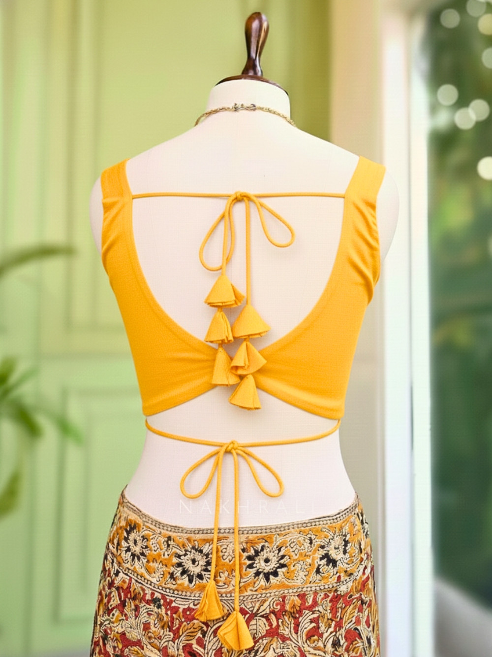 The Malika blouse blends minimal elegance with a bold festive tone. Designed with sculpted cups for a flattering fit, the clean sleeveless cut gives it a sleek, modern appeal. The highlight of this blouse is the handcrafted petal tie-back detail, adding softness and statement charm. Lightweight and comfortable, it pairs beautifully with sarees, lehengas, and fusion wear, making it ideal for haldi ceremonies, festive celebrations, pre-wedding events, and daytime functions.