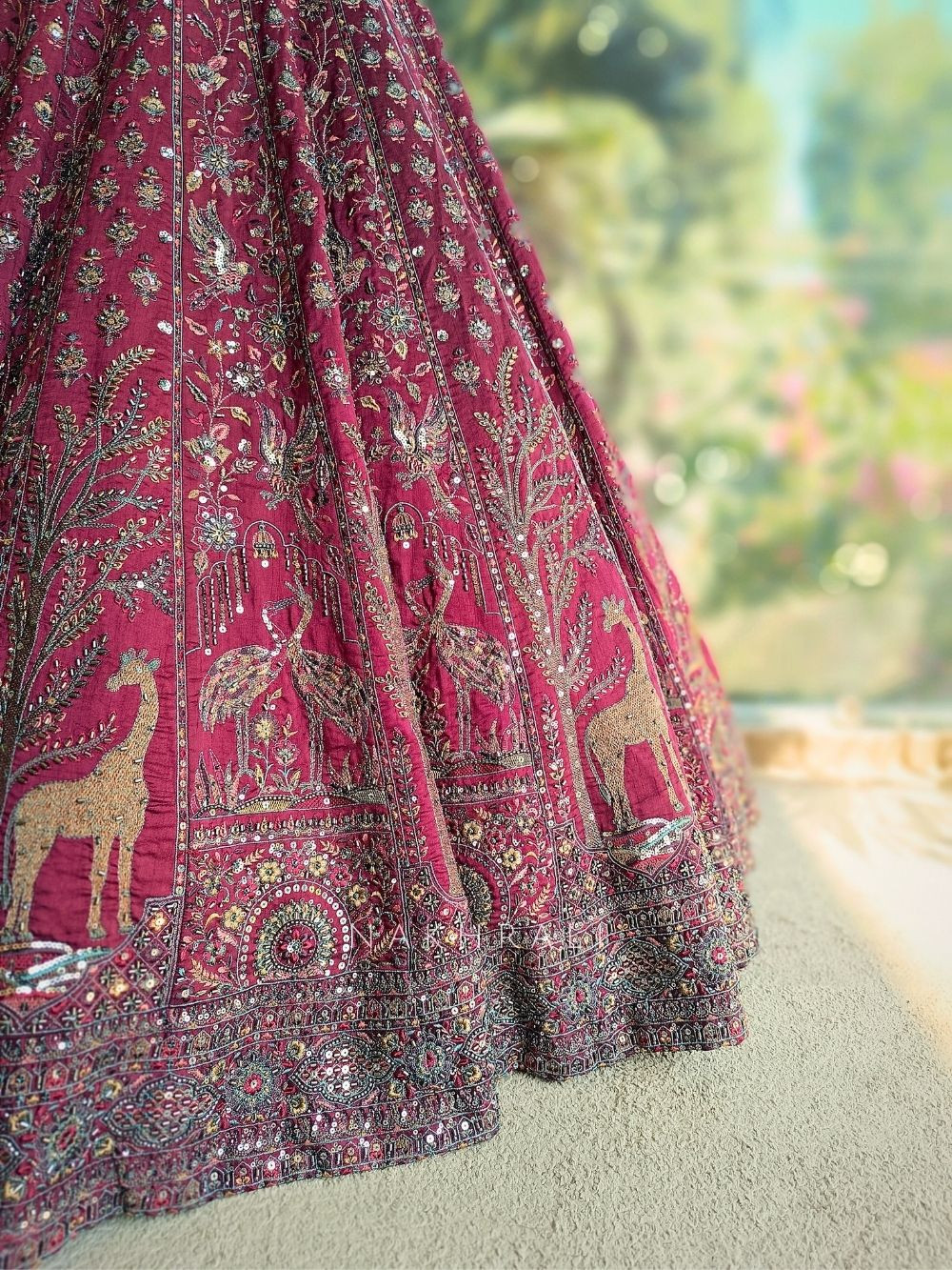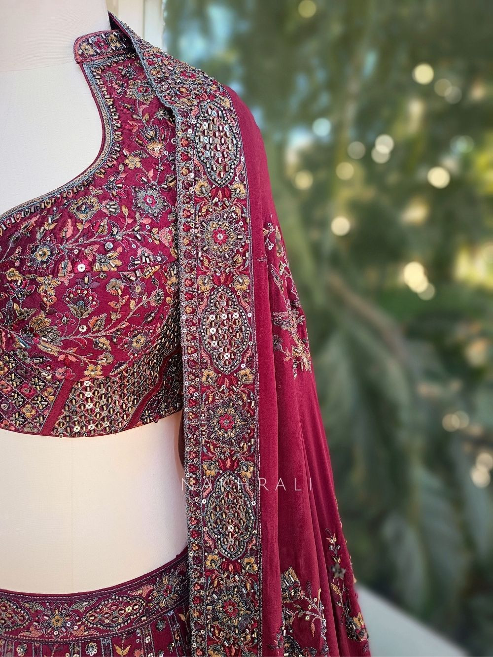 This maroon lehenga set is crafted for grand celebrations, showcasing fine embroidery enhanced with delicate sequin and bead work across the skirt. The lehenga features ornate motifs and a heavily detailed hem that adds depth and richness to the silhouette. It is paired with a beautifully embroidered blouse designed with a flattering neckline and coordinated detailing. The set is completed with a matching sheer dupatta adorned with embroidered motifs and a detailed border, adding movement and elegance. Ideal for weddings, receptions, and festive evenings where traditional craftsmanship takes center stage.