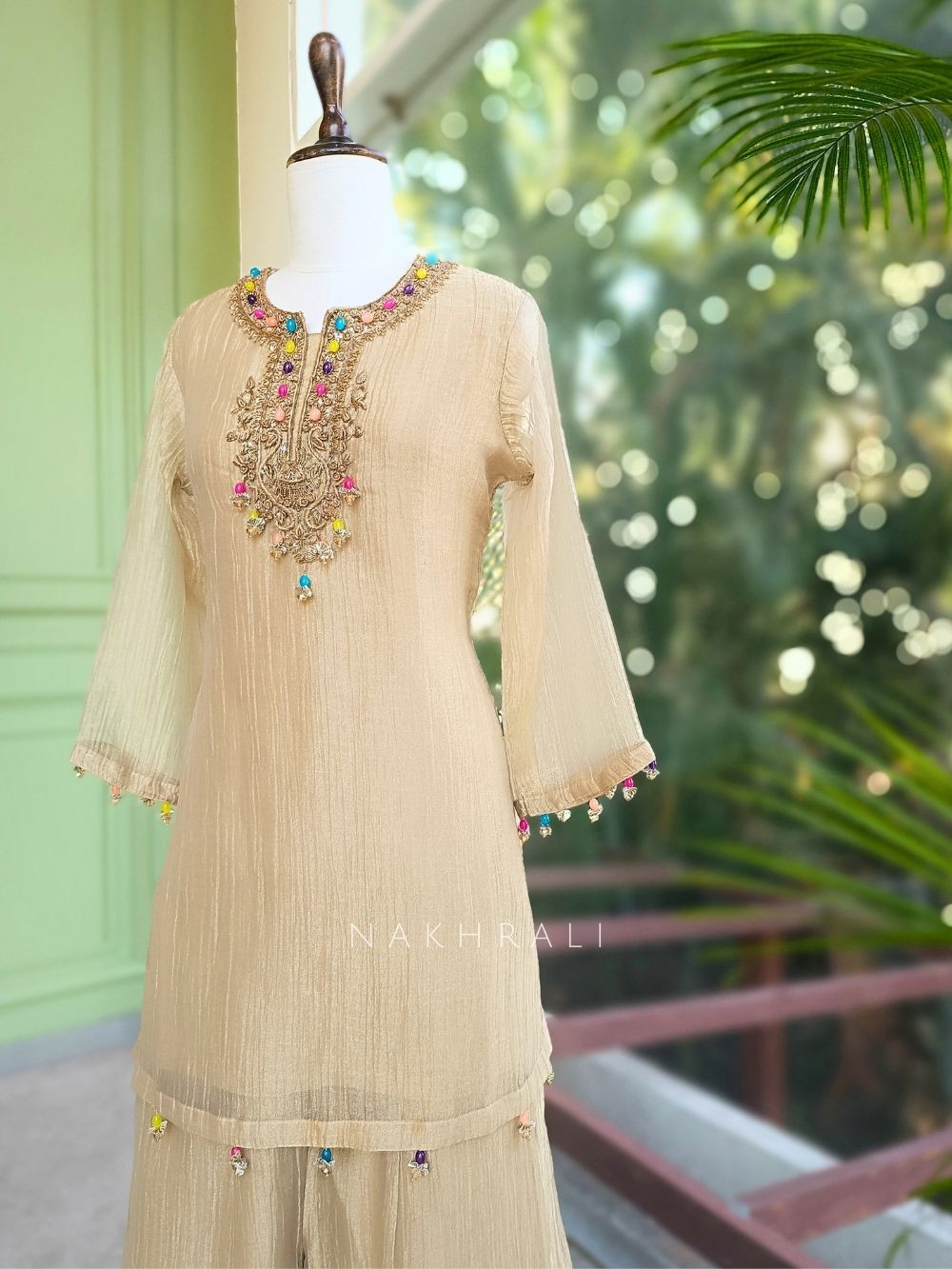 This elegant suit set showcases a refined silhouette combined with intricate handcrafted detailing. The kurta features beautiful embroidery along the neckline highlighted with colorful bead and sequin accents that add subtle festive charm. The soft textured fabric enhances the overall elegance while offering a comfortable and graceful fall. It is paired with a flowing sharara that adds volume and movement to the outfit. The coordinated dupatta with delicate accents completes the ensemble beautifully. Perfect for festive gatherings, family celebrations, and special occasions, this outfit blends simplicity with timeless elegance.