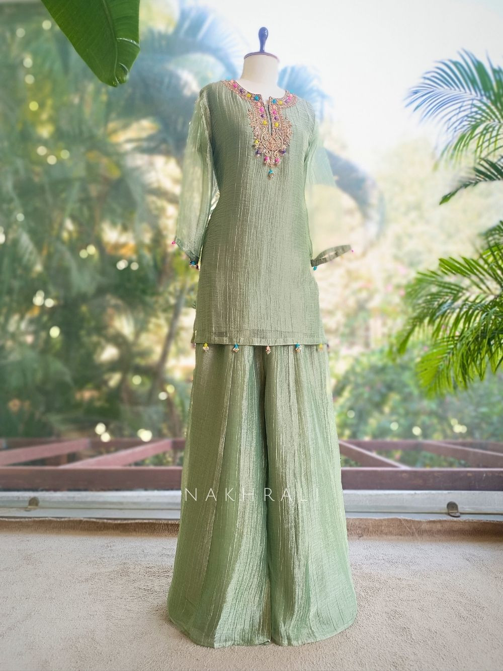 This elegant suit set showcases a refined silhouette combined with intricate handcrafted detailing. The kurta features beautiful embroidery along the neckline highlighted with colorful bead and sequin accents that add subtle festive charm. The soft textured fabric enhances the overall elegance while offering a comfortable and graceful fall. It is paired with a flowing sharara that adds volume and movement to the outfit. The coordinated dupatta with delicate accents completes the ensemble beautifully. Perfect for festive gatherings, family celebrations, and special occasions, this outfit blends simplicity with timeless elegance.