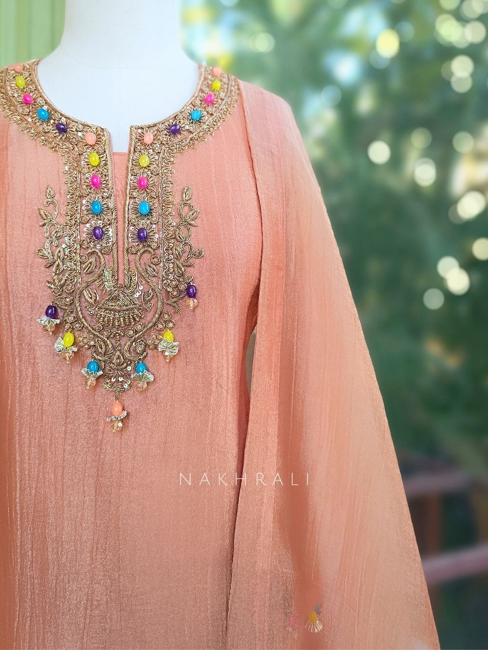 This elegant suit set showcases a refined silhouette combined with intricate handcrafted detailing. The kurta features beautiful embroidery along the neckline highlighted with colorful bead and sequin accents that add subtle festive charm. The soft textured fabric enhances the overall elegance while offering a comfortable and graceful fall. It is paired with a flowing sharara that adds volume and movement to the outfit. The coordinated dupatta with delicate accents completes the ensemble beautifully. Perfect for festive gatherings, family celebrations, and special occasions, this outfit blends simplicity with timeless elegance.