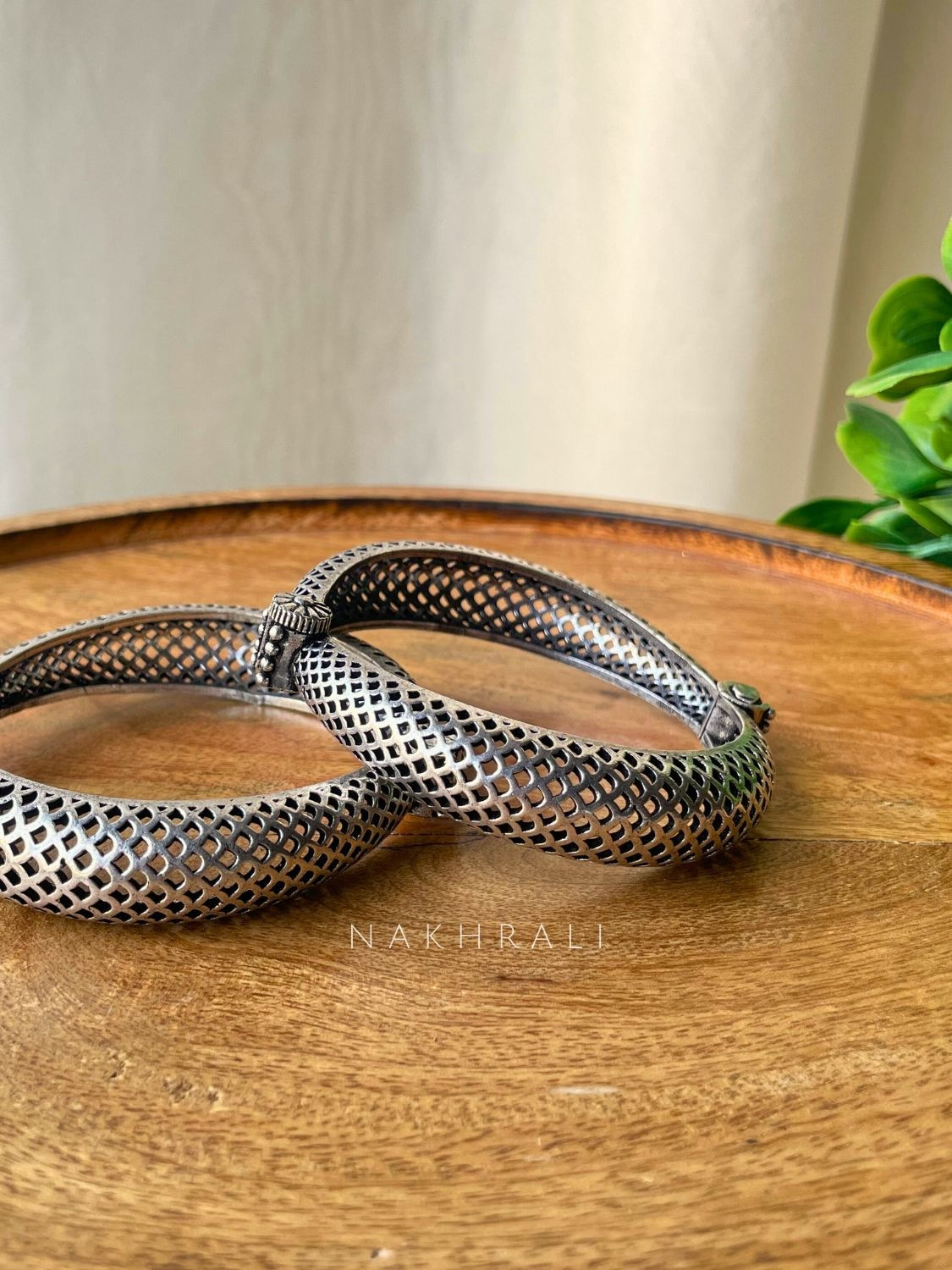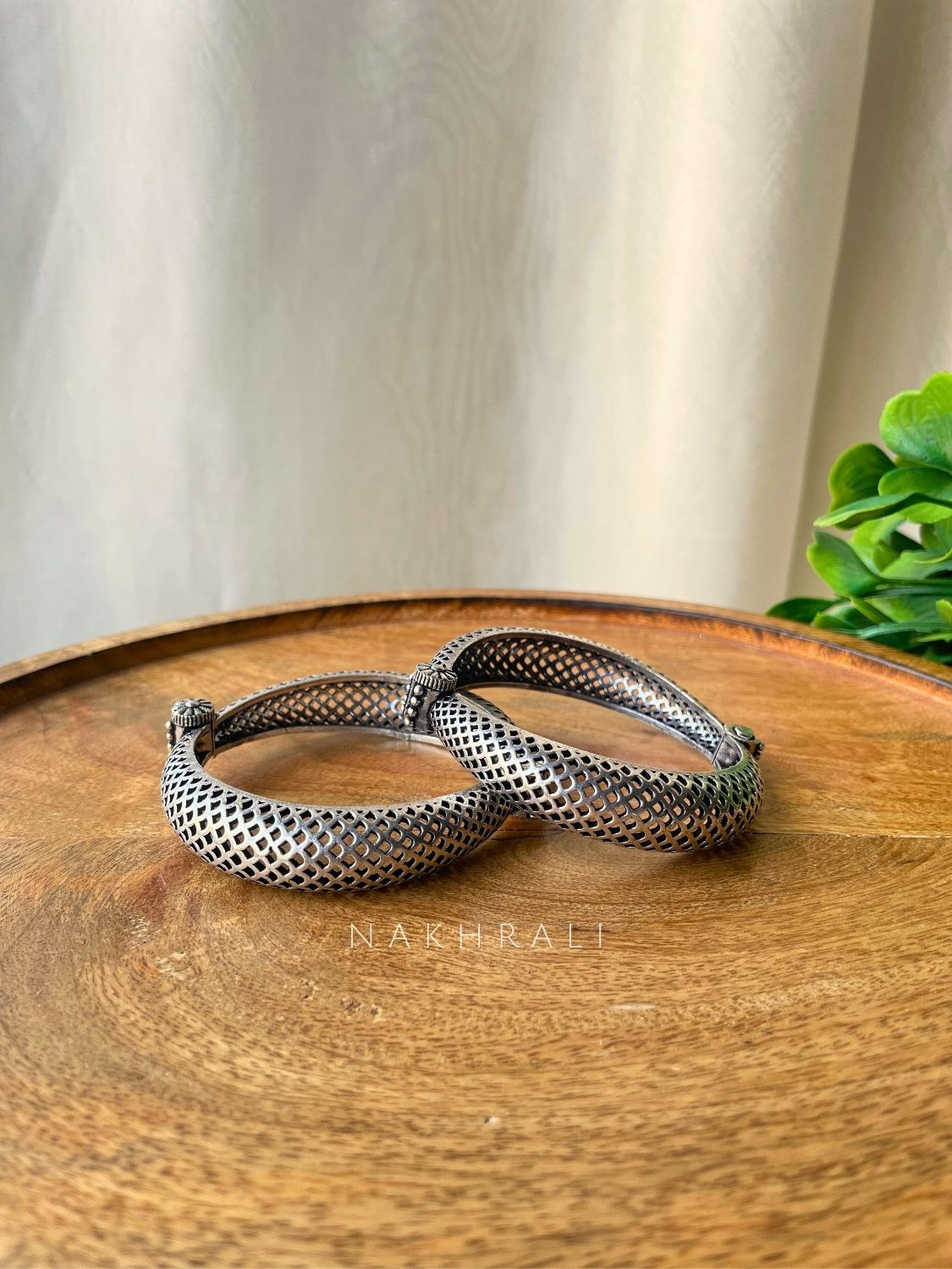Meshra is defined by its intricate lattice structure that plays with light and shadow, giving the bangle a striking yet breathable form. Crafted in oxidised silver, the openwork design adds depth without heaviness, making it comfortable for all-day wear while still holding strong visual presence. Its architectural pattern brings a modern edge to traditional silver jewellery, making it an ideal choice for those who appreciate statement pieces with refined detailing.