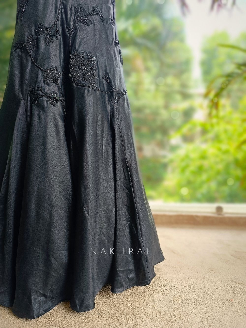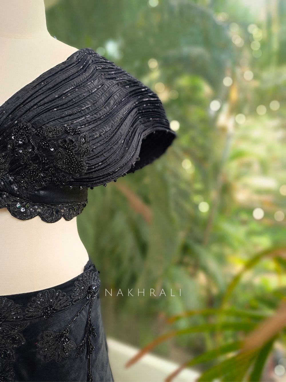Step into elegance with our Midnight Enchant Black Indo-Western Set, designed for the modern woman who loves timeless charm with a bold twist. The structured designer top, highlighted with delicate bead and sequin detailing, exudes sophistication while the scalloped edges add a unique finish. Paired with a graceful flared skirt adorned with subtle floral embroidery, this ensemble strikes the perfect balance between contemporary glamour and ethnic grace. Ideal for cocktail nights, receptions, or high-fashion soirées.