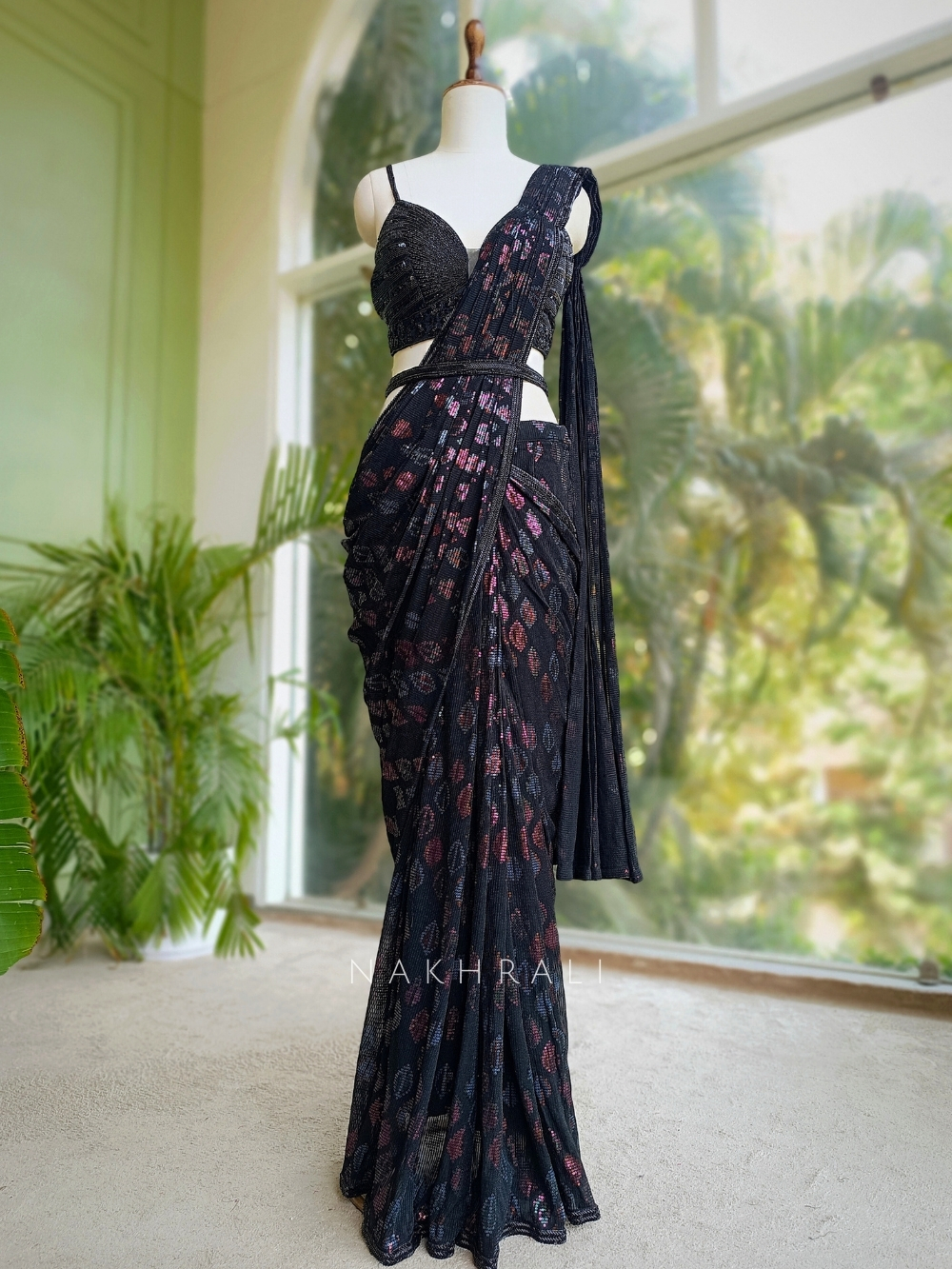 Midnight Haze captures the essence of after-dark glamour. This black pre-stitched drape saree is designed for ease and elegance, featuring intricate sequin and cut dana embroidery that catches the light with every step. Its contemporary silhouette hugs in all the right places while allowing graceful movement, making it the ideal pick for cocktail parties, wedding receptions, or modern festive celebrations. With Midnight Haze, sophistication is effortless and every entrance is unforgettable.