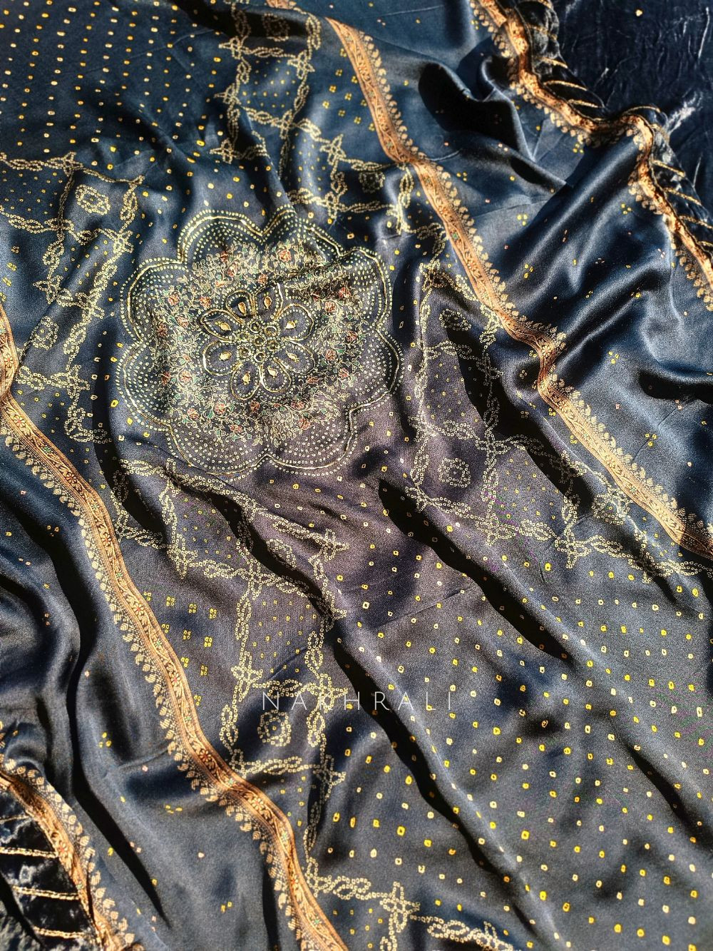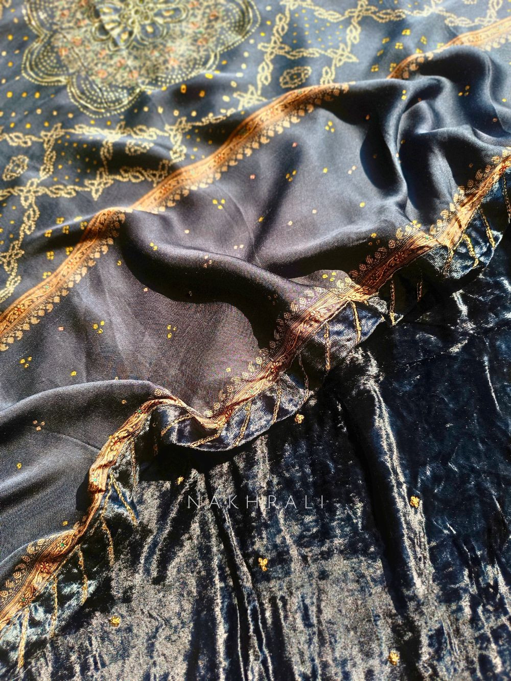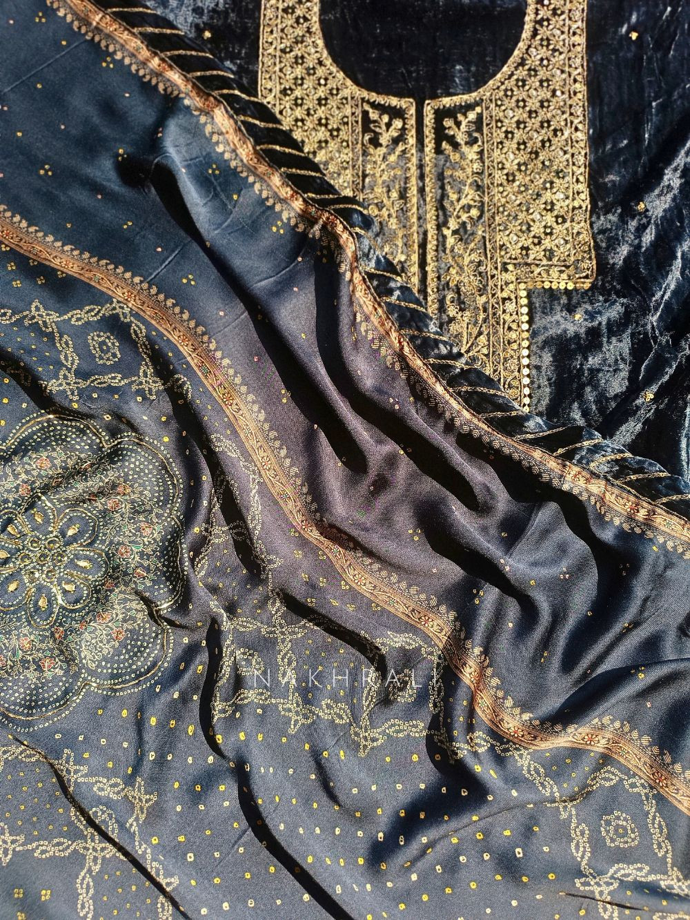 This elegant black velvet dress material is crafted with rich golden zari embroidery on the neckline, adding depth and regal charm to the outfit. The plush velvet fabric drapes beautifully, offering warmth and sophistication for winter festivities. The coordinated dupatta features traditional printed patterns and delicate detailing that enhances the full look. Ideal for receptions, festive gatherings and evening celebrations, this set blends luxury with timeless ethnic craftsmanship.