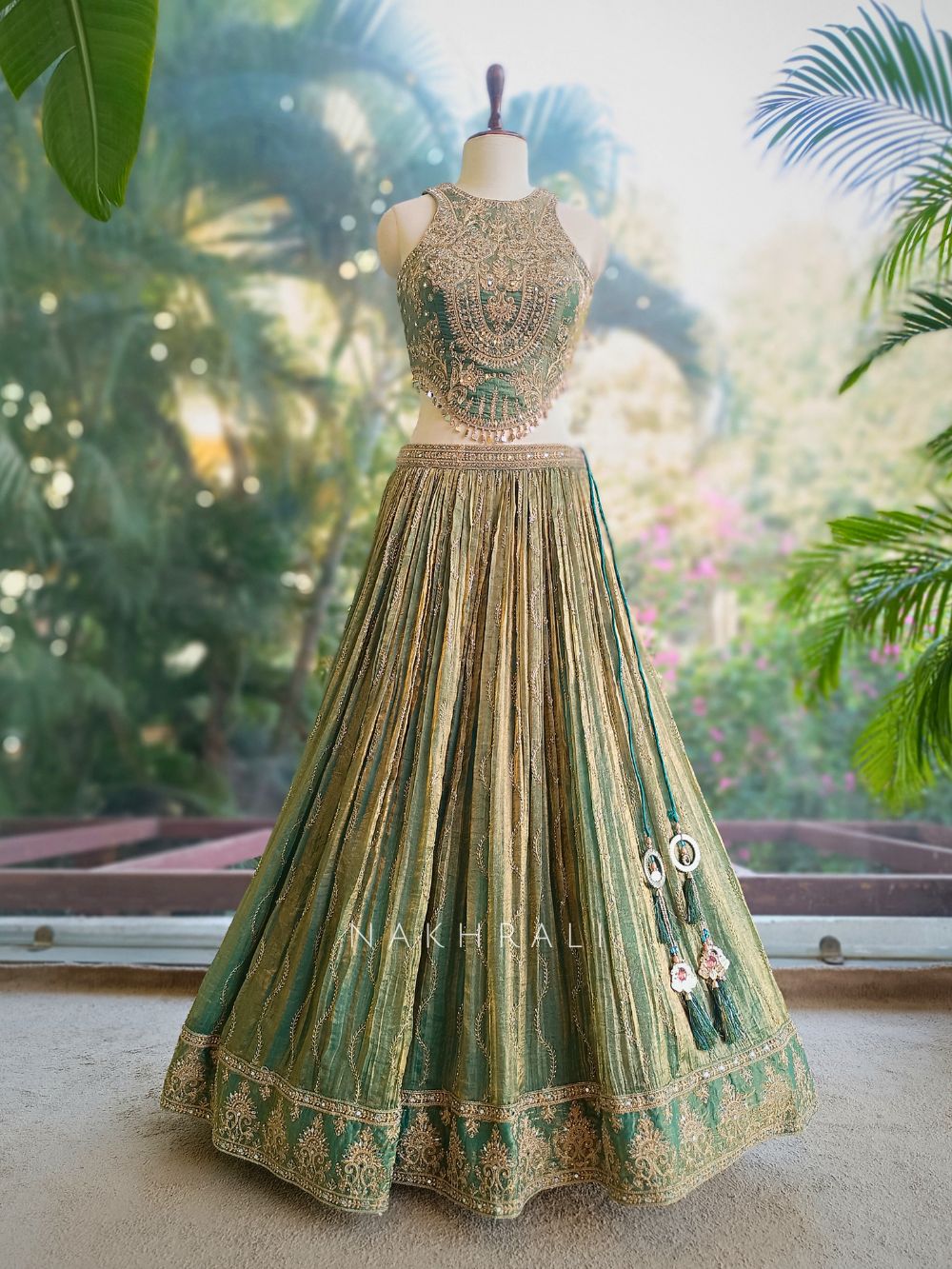 This indo-western lehenga set showcases intricate embroidery with mirror work that adds depth and shine to the overall look. The halter neck blouse is designed with a statement silhouette, finished with tassel detailing at the hem and a stylish back dori tie-up. The lehenga features a flowy flare with subtle detailing, paired with a coordinated dupatta, making it ideal for festive celebrations, sangeet nights, and wedding functions.