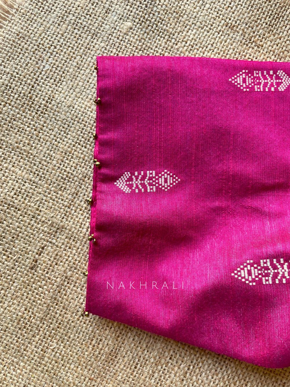 The Miwa blouse is crafted in smooth silk fabric and features subtle woven ikat butti work, where the motifs are created directly during weaving for a refined, textured finish. The neckline and sleeve edges are enhanced with fine hand-applied bead detailing, adding a soft highlight without overpowering the design. Designed with a classic scoop neckline and a secure back tie-up, this blouse balances comfort and detailing, making it suitable for daily wear, office sarees, and light festive looks. It comes in five versatile colors to pair effortlessly with printed, solid, or textured sarees.