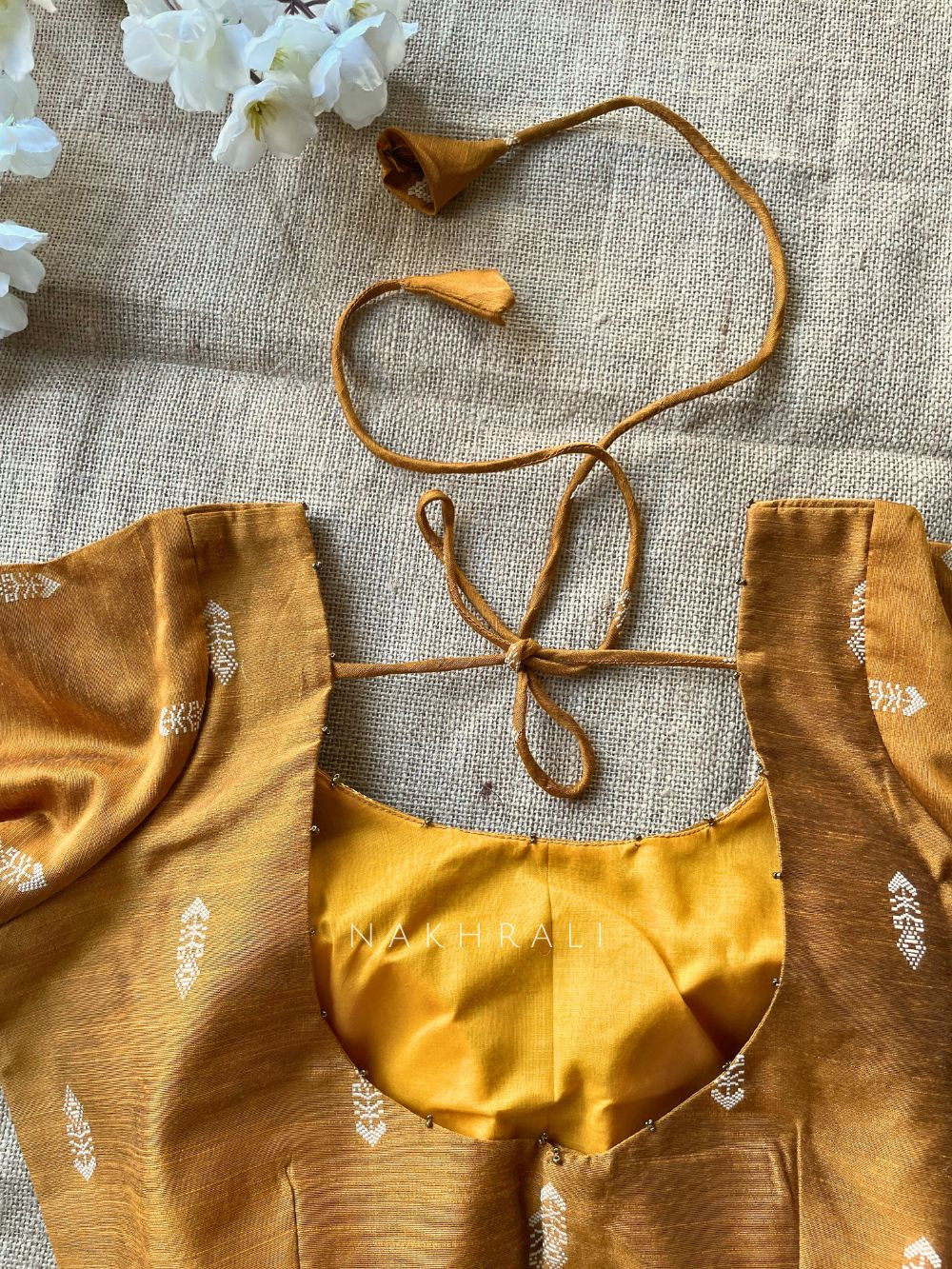 The Miwa blouse is crafted in smooth silk fabric and features subtle woven ikat butti work, where the motifs are created directly during weaving for a refined, textured finish. The neckline and sleeve edges are enhanced with fine hand-applied bead detailing, adding a soft highlight without overpowering the design. Designed with a classic scoop neckline and a secure back tie-up, this blouse balances comfort and detailing, making it suitable for daily wear, office sarees, and light festive looks. It comes in five versatile colors to pair effortlessly with printed, solid, or textured sarees.