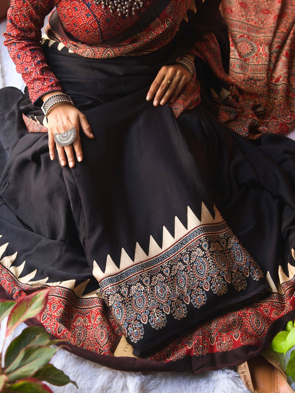 • Festive Gatherings: Pair with oxidised silver jewellery and a bold lip for a grounded traditional look.