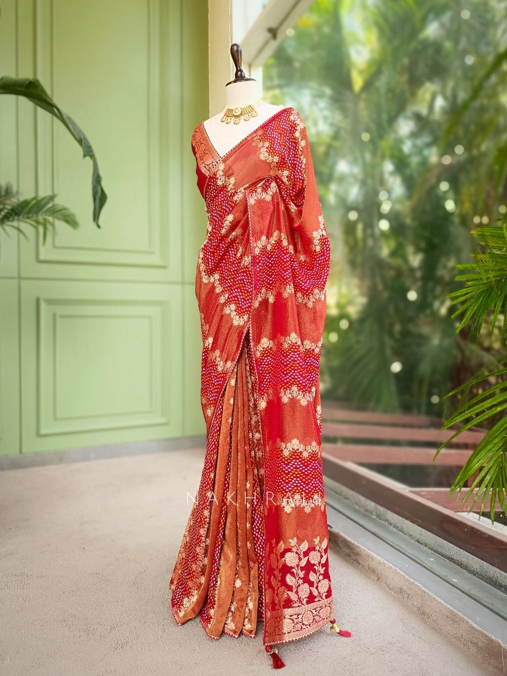 Morvyn Red Saree with Bandhani Print and Zari Weave