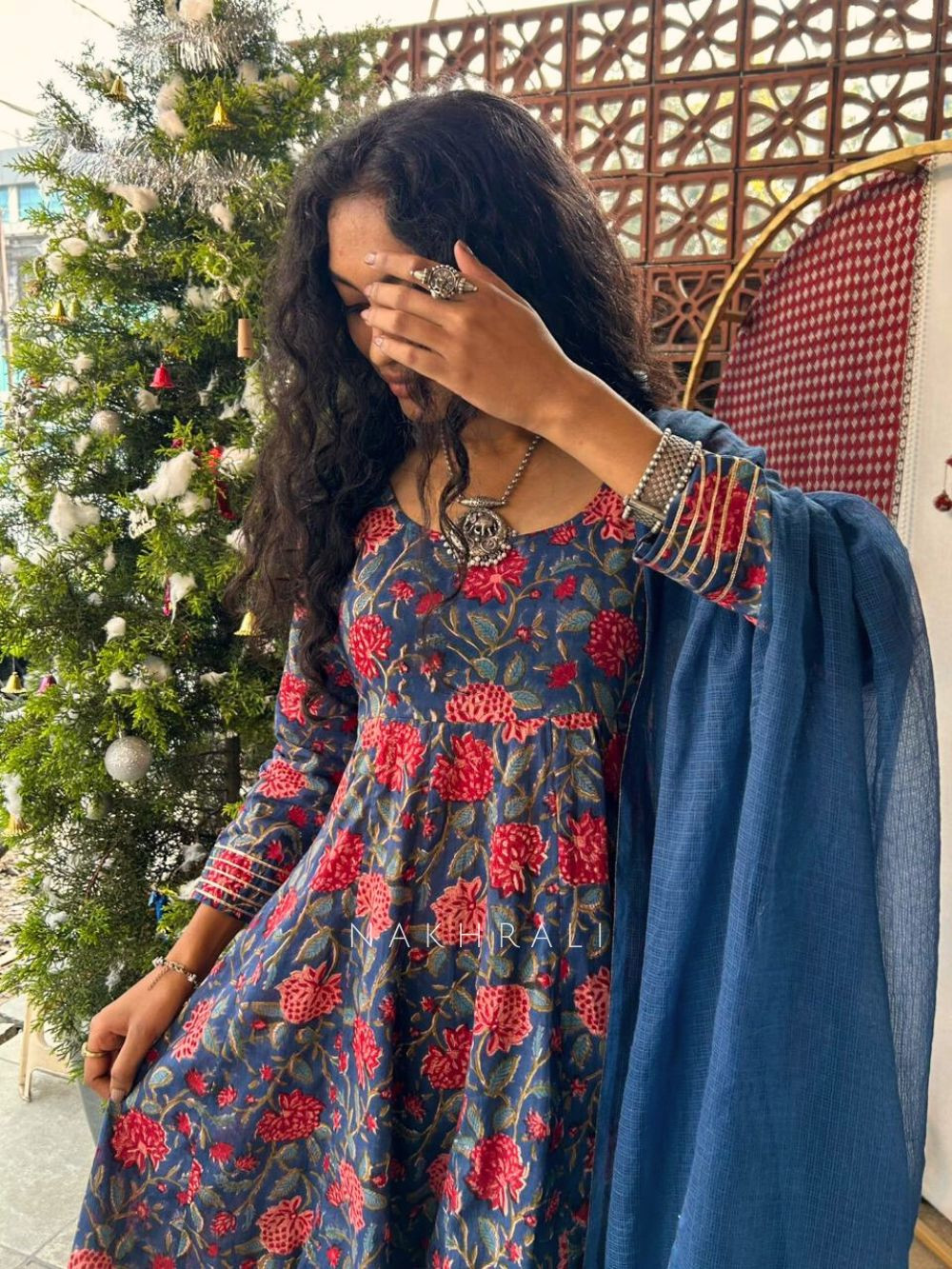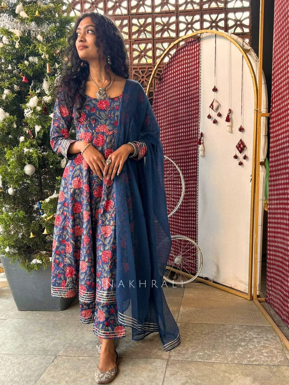 Mrigya Blue Floral Cotton Anarkali Suit Set with Gota Work
