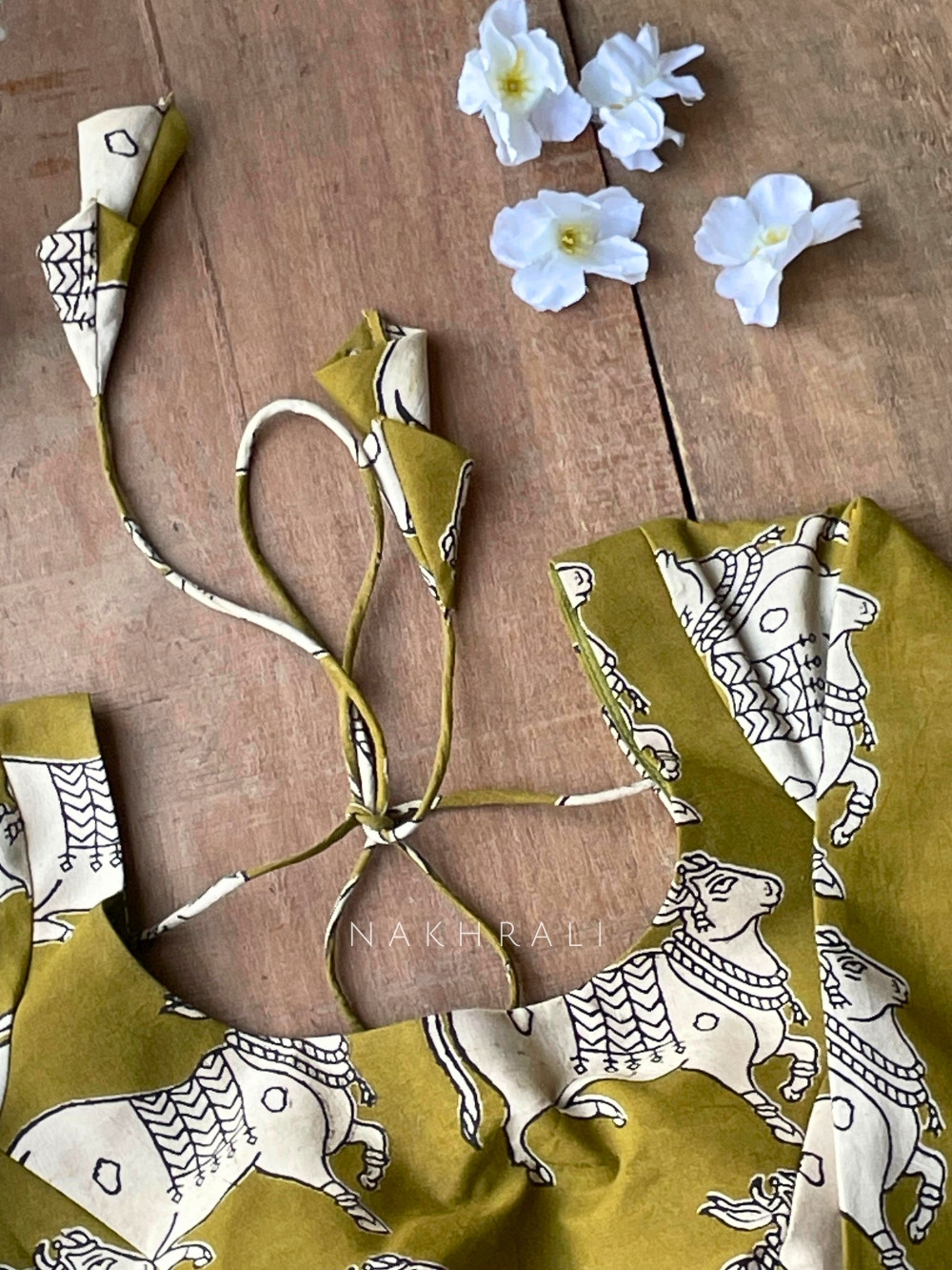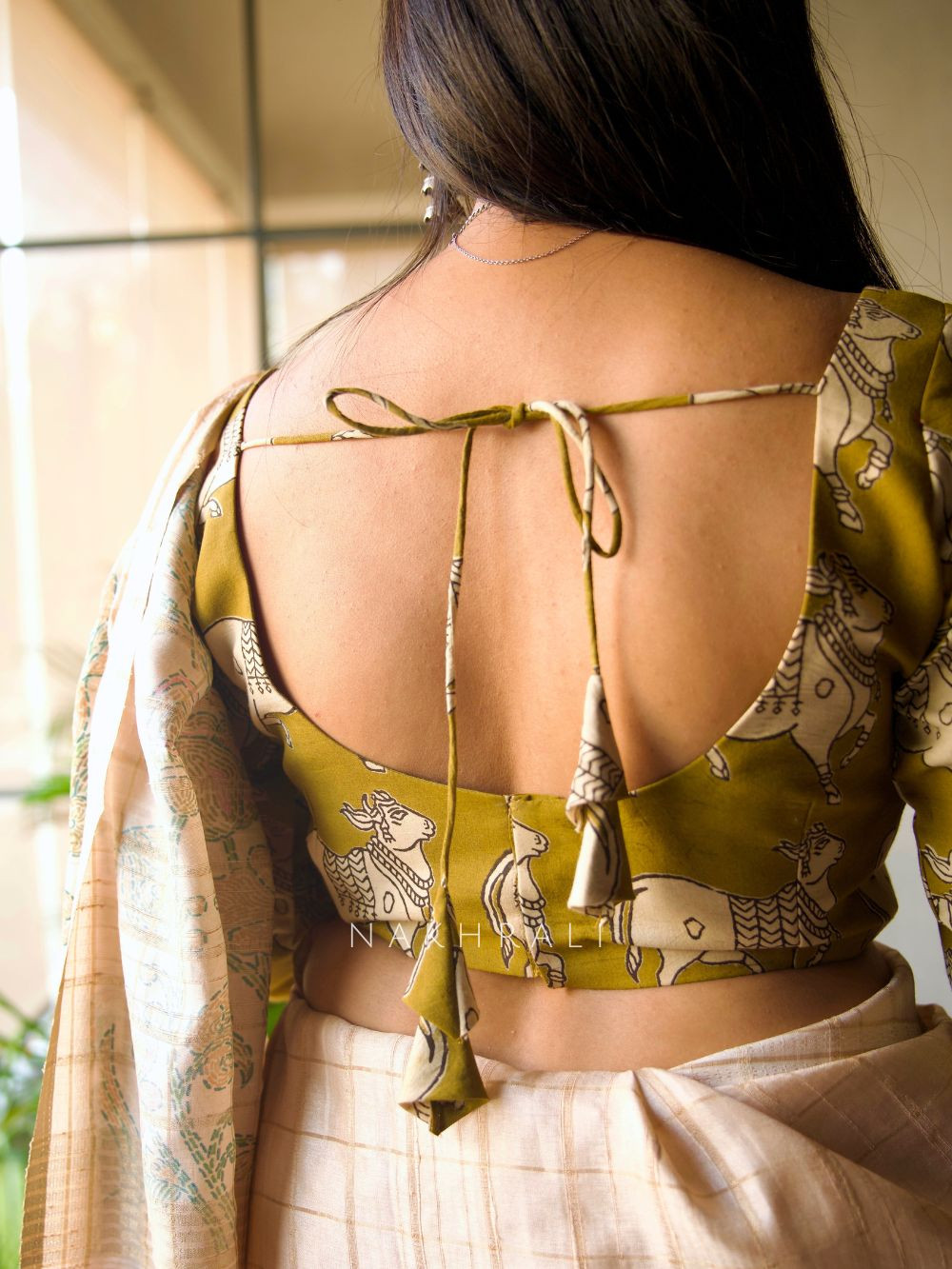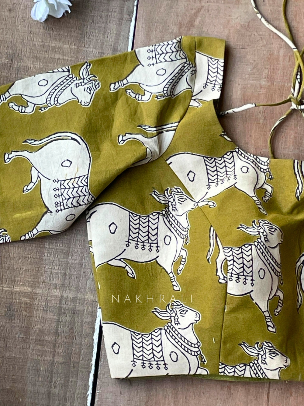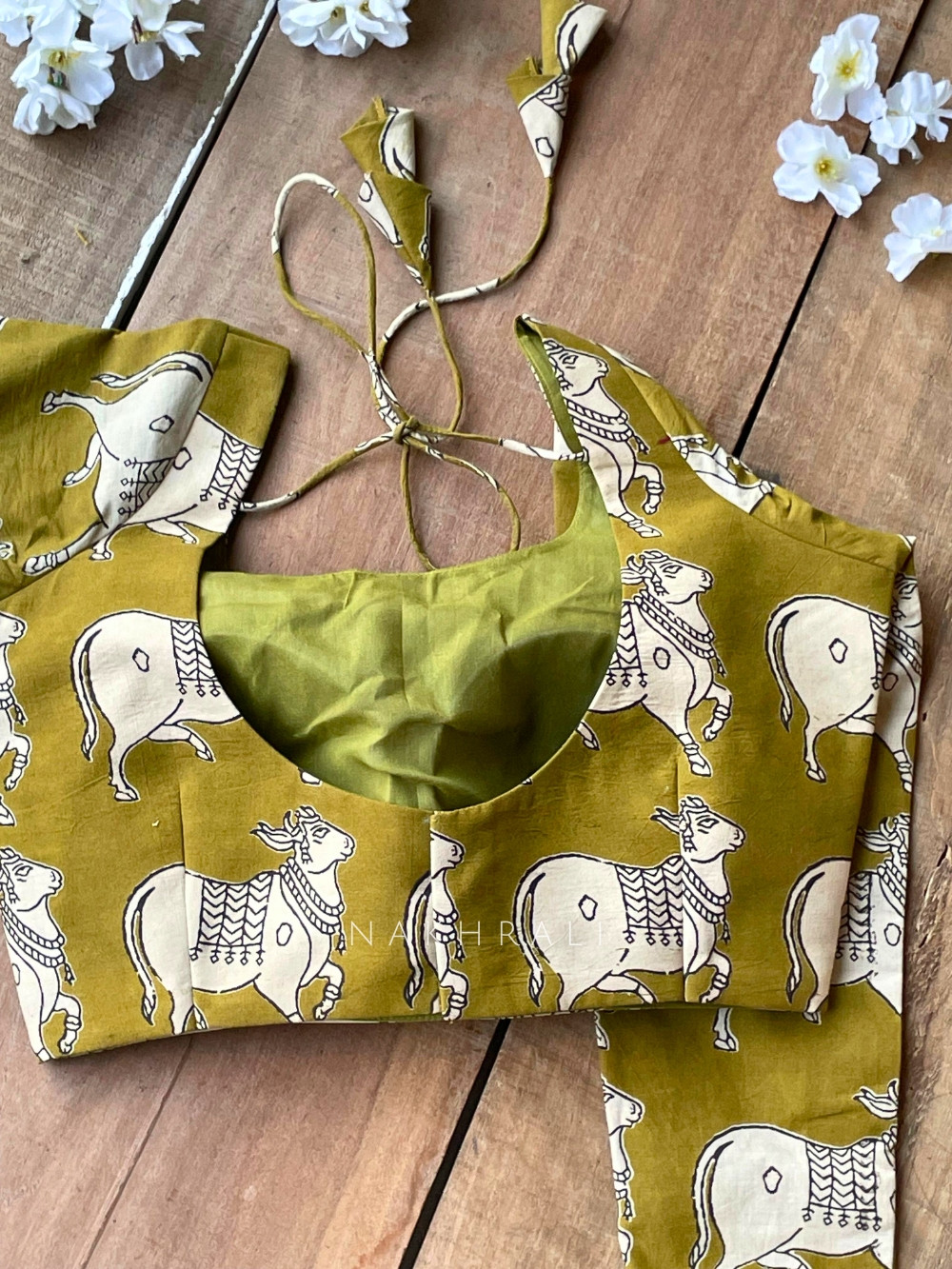 The Nandi Mehndi Green Cotton Printed Blouse blends cultural artistry with everyday comfort. Crafted from breathable cotton, it features intricate Nandi motifs all over, a flattering round neckline, elbow-length sleeves, and a secure tie-back for an adjustable fit. The structured cut ensures a neat silhouette that pairs beautifully with handloom sarees, silk drapes, and festive prints. Perfect for pujas, cultural gatherings, family functions, and elegant daytime styling.