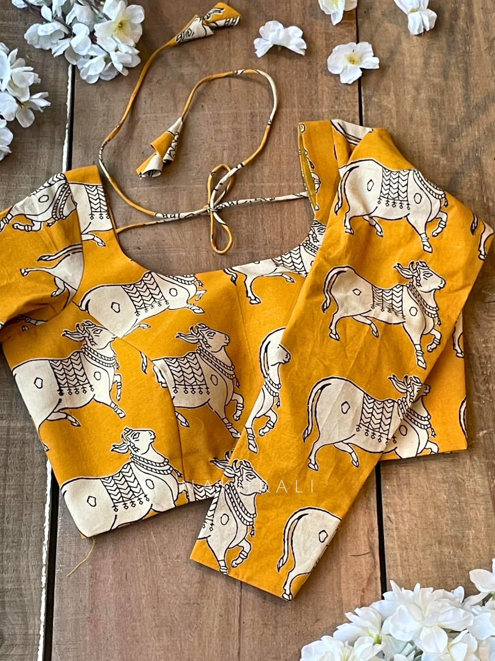 This yellow cotton blouse stands out with its striking Nandi cow print, crafted for comfort and everyday charm. Designed with a rounded neckline, elbow-length sleeves and a secure back dori tie-up, it blends tradition with easy wearability. The breathable cotton fabric makes it ideal for festive gatherings, puja days, or casual ethnic styling. Pair it with handloom, block print or solid sarees for a graceful, earthy look that feels effortlessly stylish.