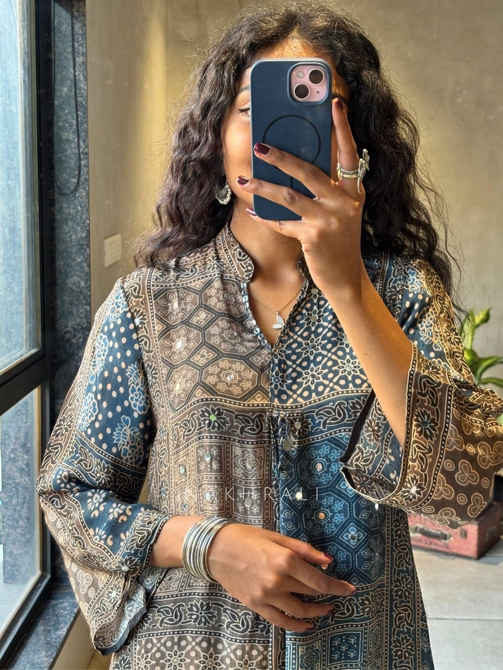 This kurta pant set showcases a distinctive patchwork-inspired print that blends traditional motifs with a contemporary layout. The kurta features a straight silhouette with a smart neckline and comfortable sleeves, creating a structured yet relaxed look. Subtle sequin detailing adds a soft shimmer that enhances the design without overpowering the intricate prints. Paired with matching straight pants, the ensemble feels balanced and versatile, making it suitable for casual outings, daytime gatherings and effortless festive styling.