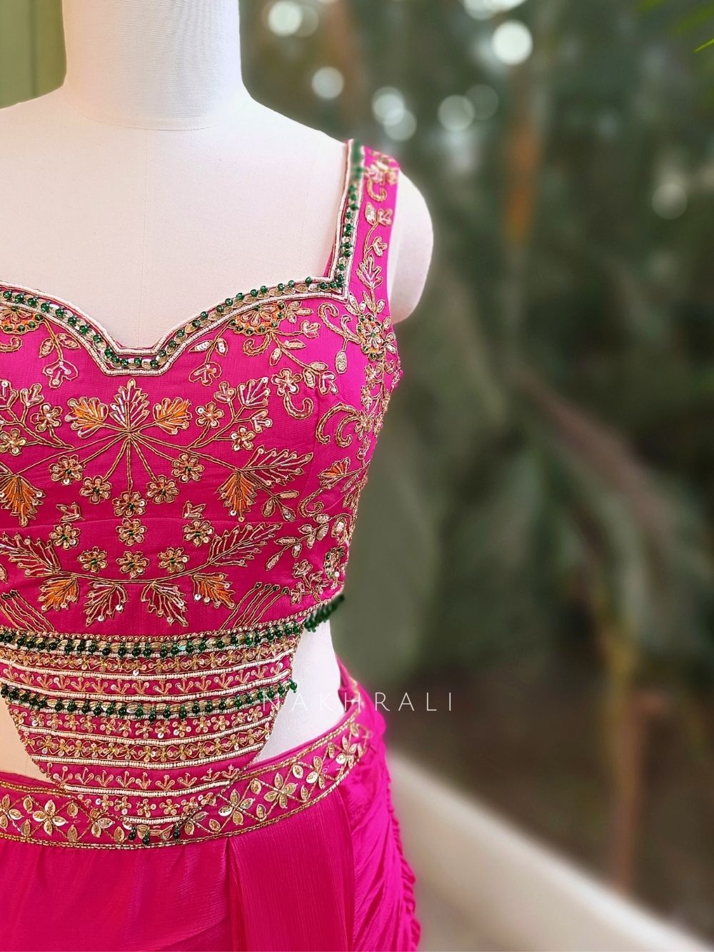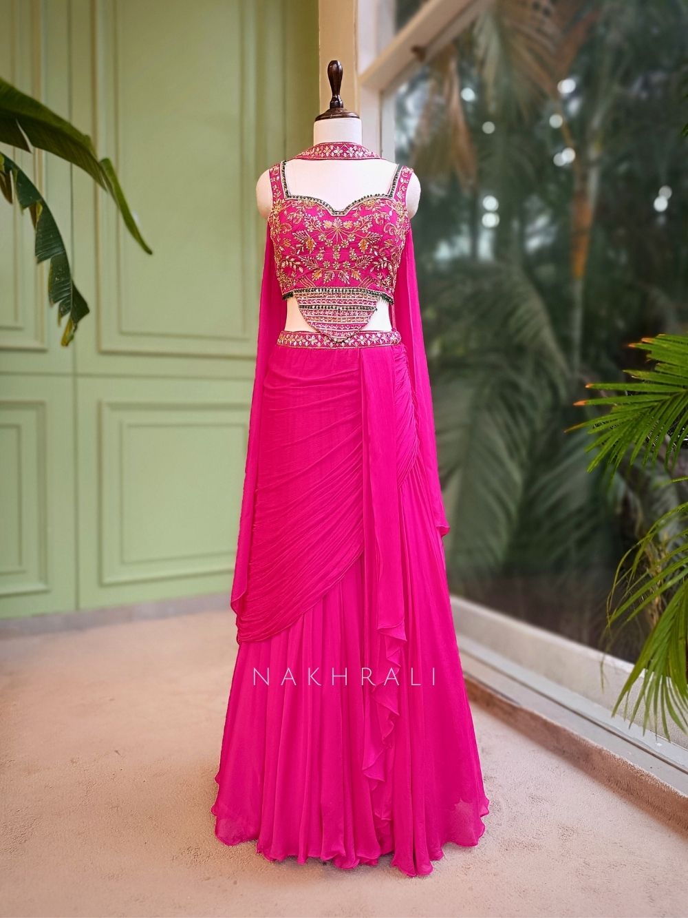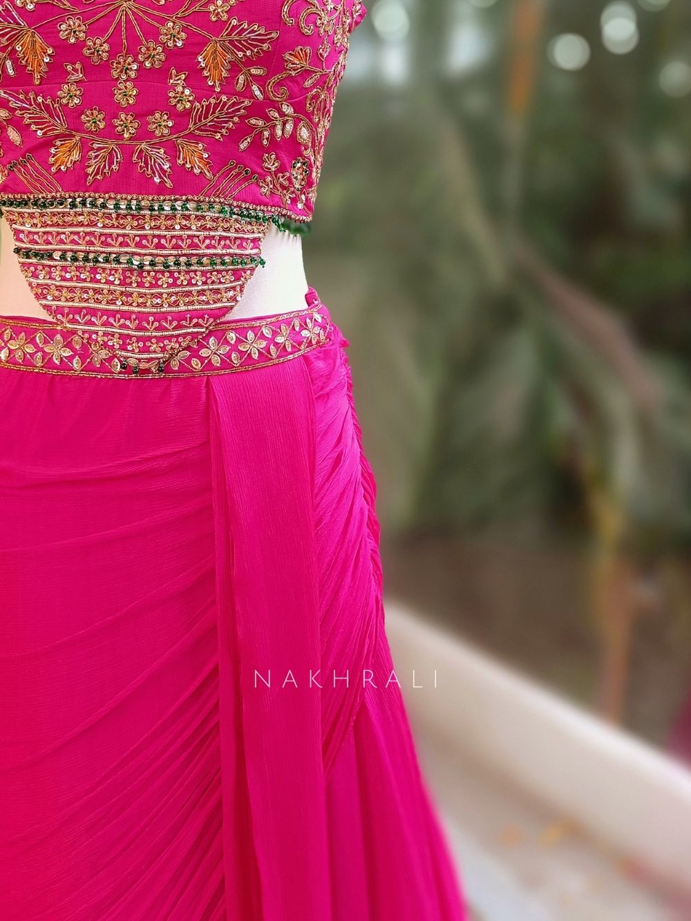 This magenta indo-western dress features a structured embroidered blouse detailed with intricate zari, cut dana, and sequin work in floral and geometric patterns. The blouse has a defined neckline with embroidered straps, a stylish cut-out waist, and an embellished waistband that adds visual structure. The back is designed with a tie-up opening for adjustable fit. It is paired with a soft, flowy draped skirt that creates elegant movement, making it ideal for sangeet nights, festive celebrations, and contemporary wedding events.
