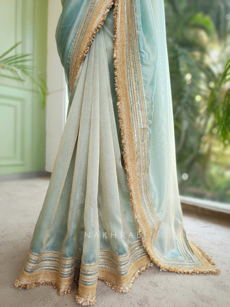 As this is a designer saree, the border design and Blouse Print may vary slightly from piece to piece.Adorned With Zari thread work and Kiran on Border of the saree.