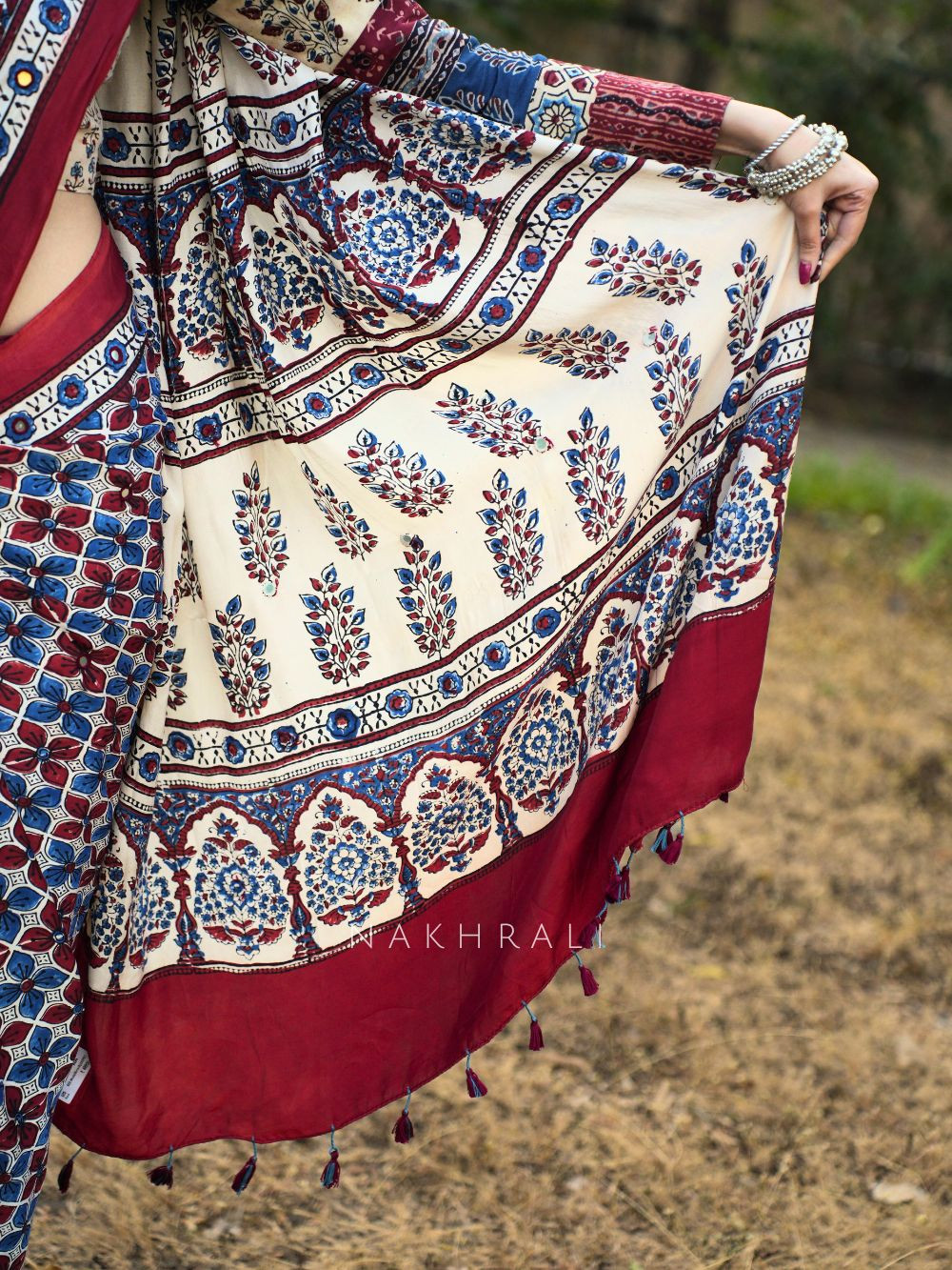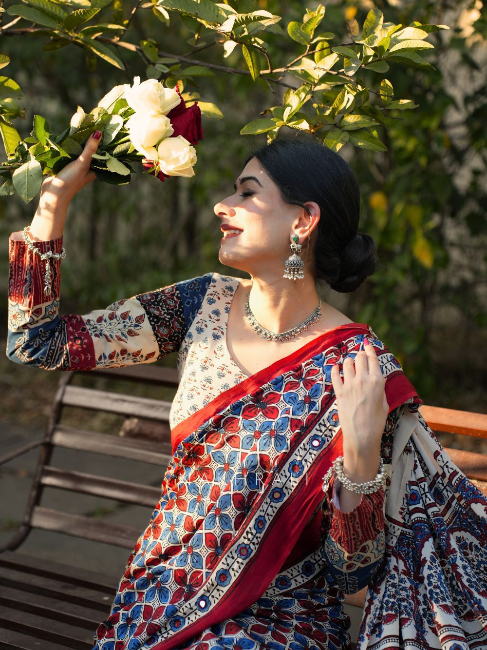 Neerja is a graceful modal silk saree crafted for women who appreciate fluid drapes and timeless prints. The saree features beautifully composed motifs and borders that create visual depth without feeling heavy. The soft modal silk fabric offers a smooth fall and comfortable wear across seasons. It comes with a matching unstitched blouse piece, allowing it to be stitched in the preferred style. Ideal for day events, festive gatherings, and refined everyday dressing.
