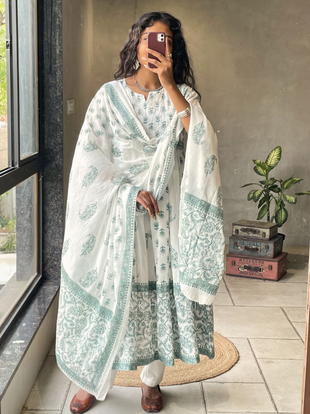This cotton suit set blends everyday comfort with subtle elegance, designed in a soothing blue floral block print. The kurta features a structured pleated yoke with a soft round neckline, giving it a polished yet relaxed look. Paired with matching bottoms and a lightweight printed dupatta, the outfit is breathable and easy to carry throughout the day. Ideal for office wear, casual meetings, and summer outings, it offers a clean and refined aesthetic without feeling heavy.